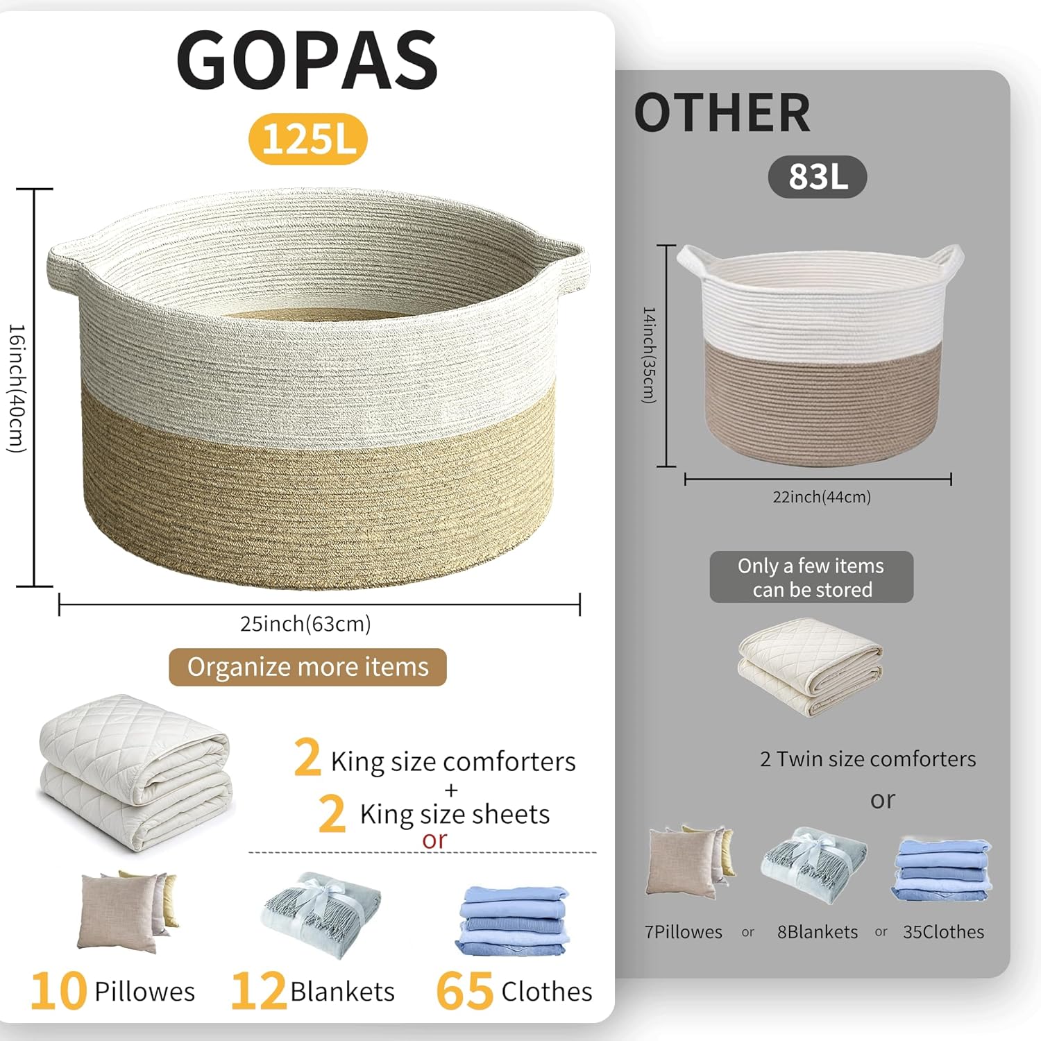 125L Extra Large Blanket Basket, 25" x 16", Jumbo Laundry Woven Baskets Decorative Home, Cotton Rope Basket with Handles, Baby Toy Baskets for Storage, White & Brown,2PC