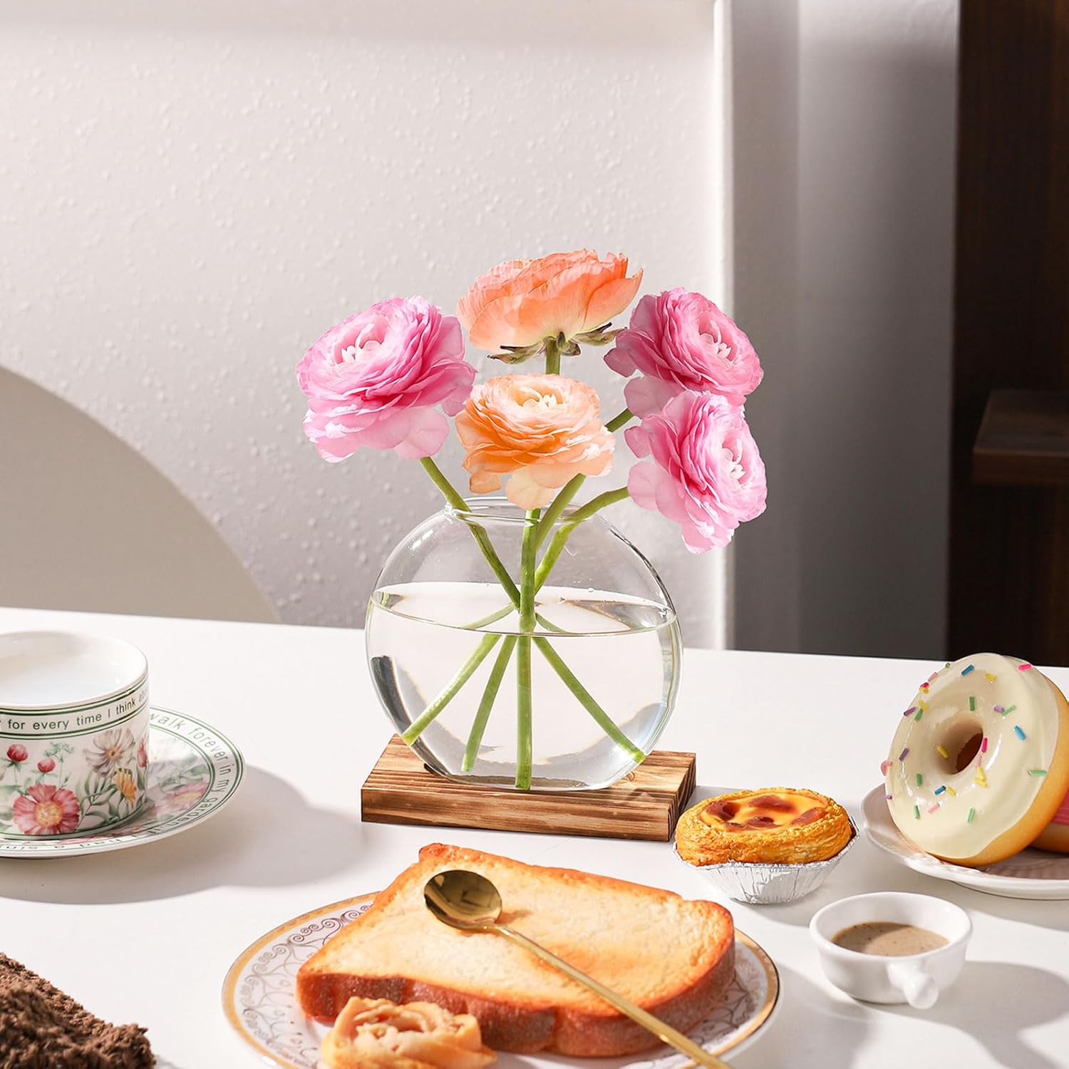 2 Pack Plant Propagation Station with Wooden Base Glass Terrariums for Indoor Plants Decorative Round Vases for Flowers Hydroponic Planter for Home Office Decor