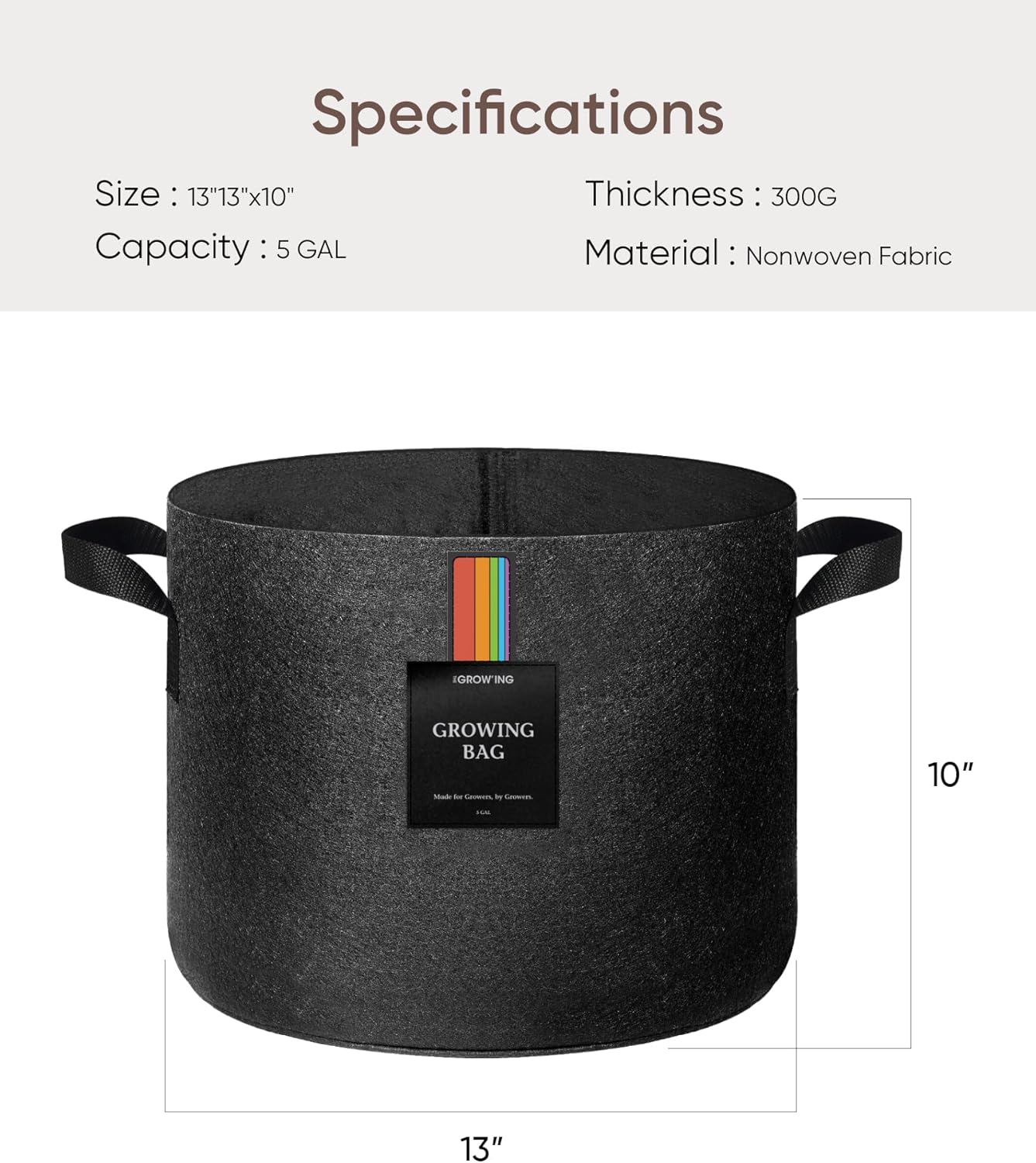 The Growing 5 Pack 5 Gallon Fabric Grow Bags,Thickened Aeration Nonwoven Fabric Plant Pots with Durable Handles,Heavy Duty 300G Planter Pot for Tomato, Fruits, Vegetables and Flowers, Black