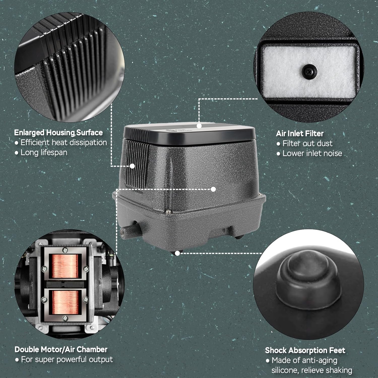 - QUIET - Our linear air pump experiences near-silent performance thanks to our multi-layer noise reduction system: double-layered housing, vibration-absorbing silicone feet, and precision silicone gasket sealing.