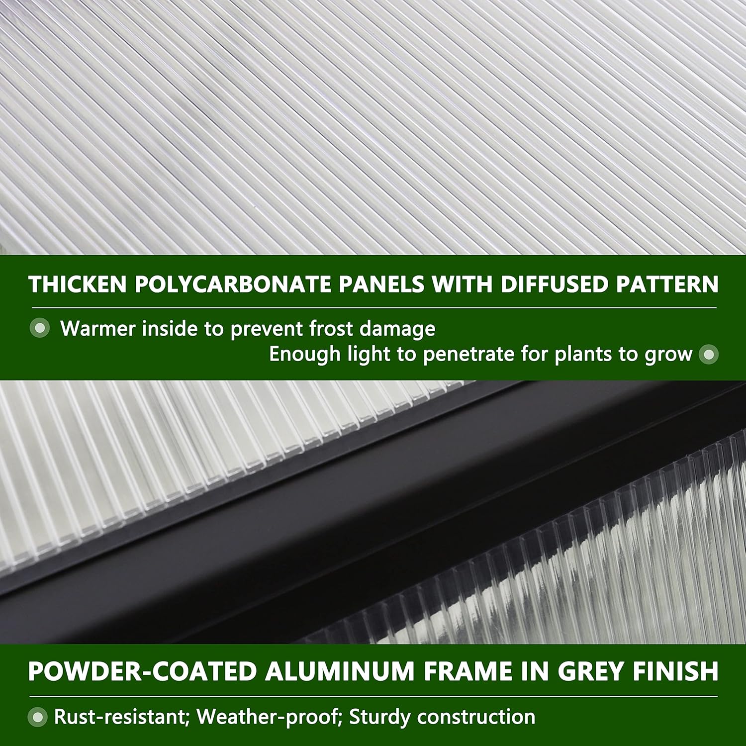 - Heavy Duty Greenhouse for Outdoor: The frame of our greenhouse is made of high quality, corrosion and weather resistant gray powder coated thickened aluminum which is rust resistant and stable in all climates. Thick polycarbonate panels with a diffusion pattern provide extra warmth for the plants while preventing frost, making the plants absorb more sunlight and thrive