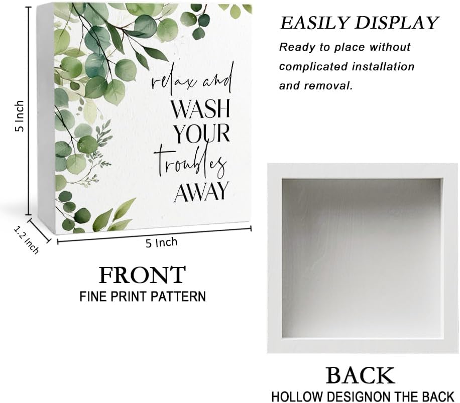 Funny Bathroom Signs, Wash Your Troubles Away Funny Bathroom Wooden Box Sign, Eucalyptus Botanical Wood Signs Plaque for Restroom Washroom Toilet Counter Shelf Table Decor, 5x5 Inch