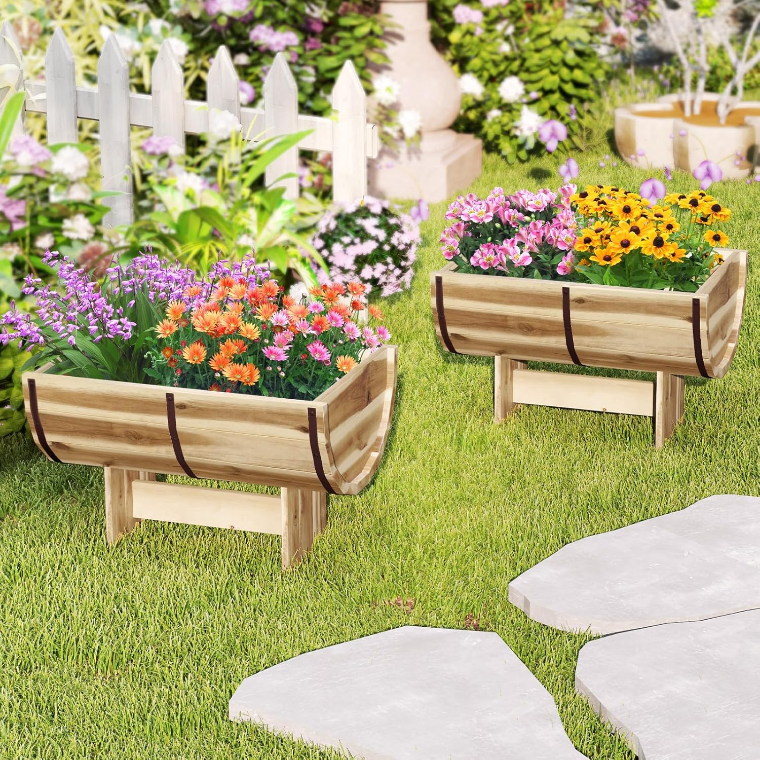 HAPPYGRILL Wooden Plant Pots, Solid Acacia Wood Half-Barrel Planting Flower Pot w/Legs, Drainage for Flower Vegetable Fruit, Outdoor Elevated Garden Bed, Decorative Planters for Indoor Plants (2)