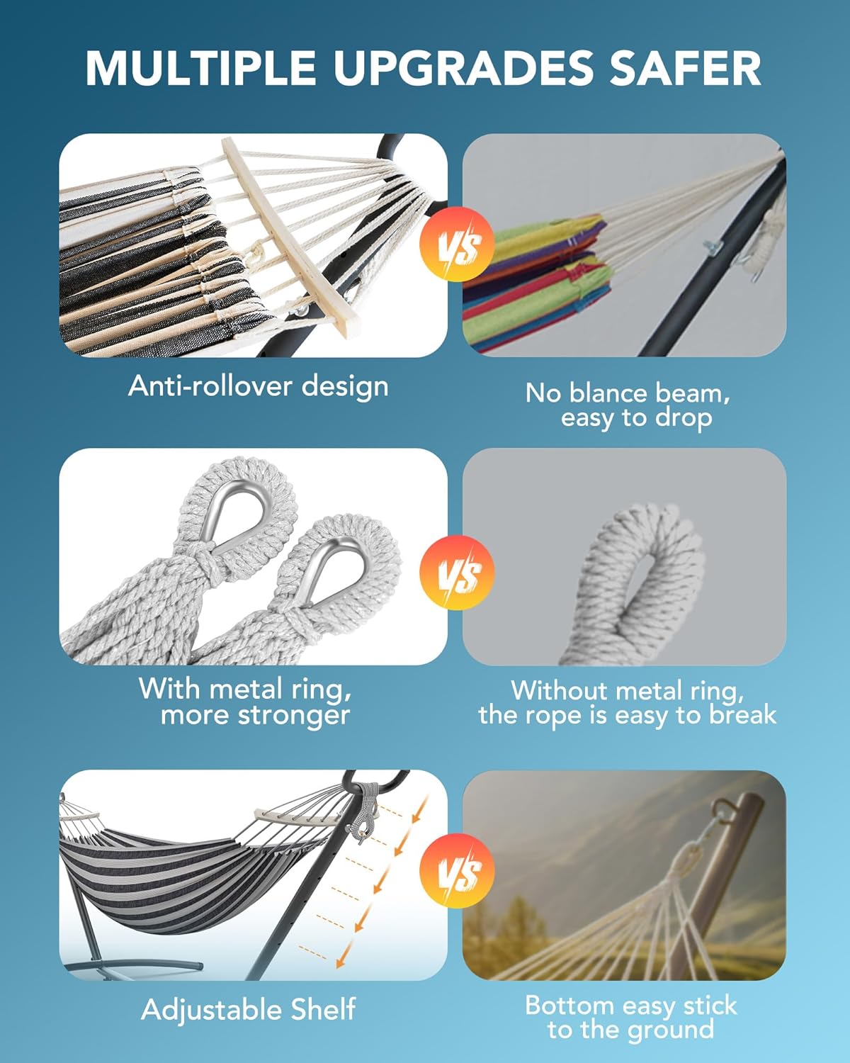 - Anti-Rollover Design: Our double Hammocks feature Balance spreader bars for an anti-rollover design, ensuring even hole spacing and a tight hammock for optimum balance. Enjoy a secure and stable relaxation experience
