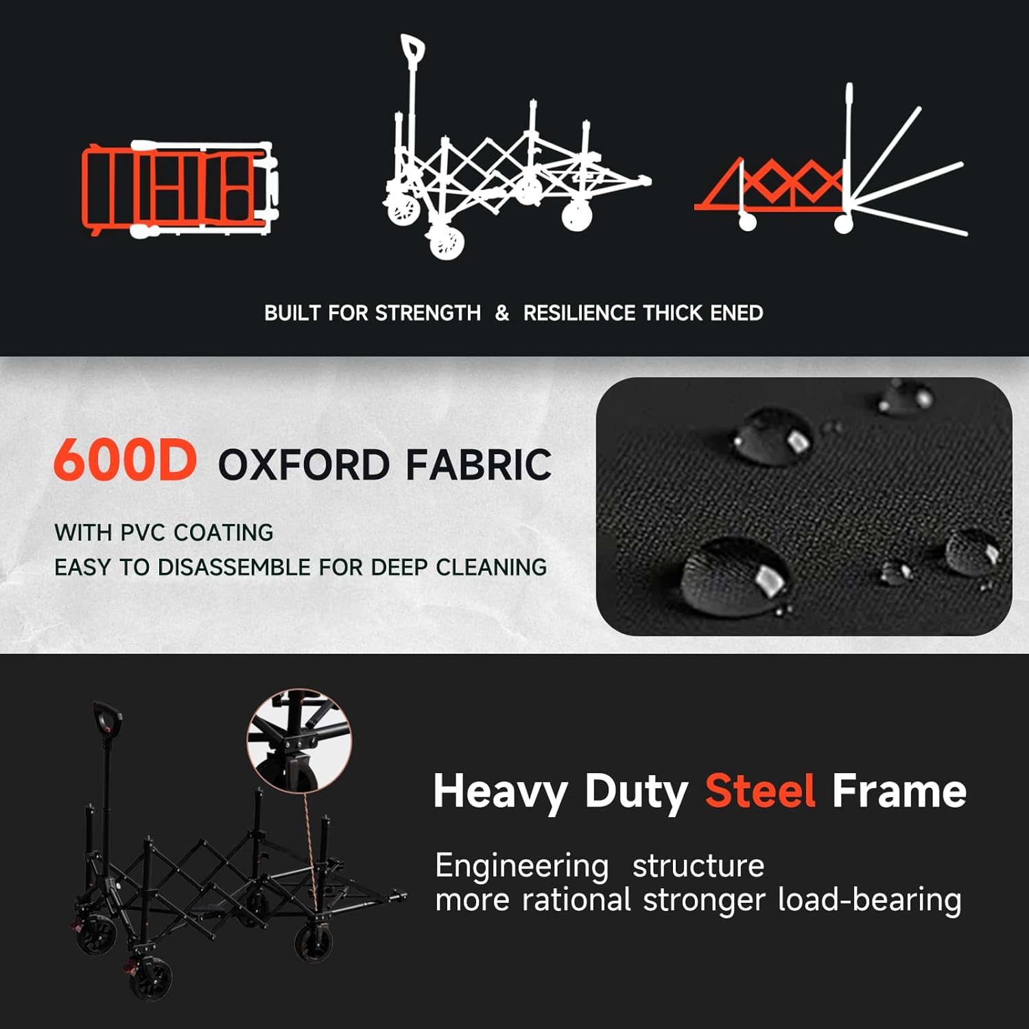 - 【Smooth transportation】The folding wagon cart with wheels adjustable handle to confirm different heights; The front part with brakes can rotate 360 ° with 2 wheels, which can not only run smoothly on the road, but also brake on slopes to prevent slipping