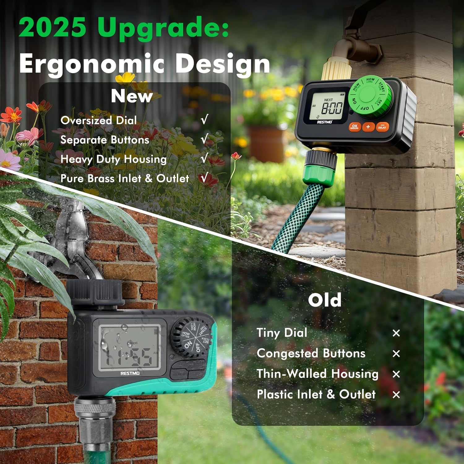- 【Upgrade Waterproof & Durablity】The pure brass inlet and outlet are heavy duty and enhance durability, easy to tighten without stripping the threads. Engineered for absolute leak-proof confidence, seamless embedded screen eradicates water ingress, while the rugged textured panel withstands harsh wear. oversized dial and button for easy programming. Rotate the dial to set clock, start time, how long and how often. Then your irrigation system will become automatic and operate as per the program.