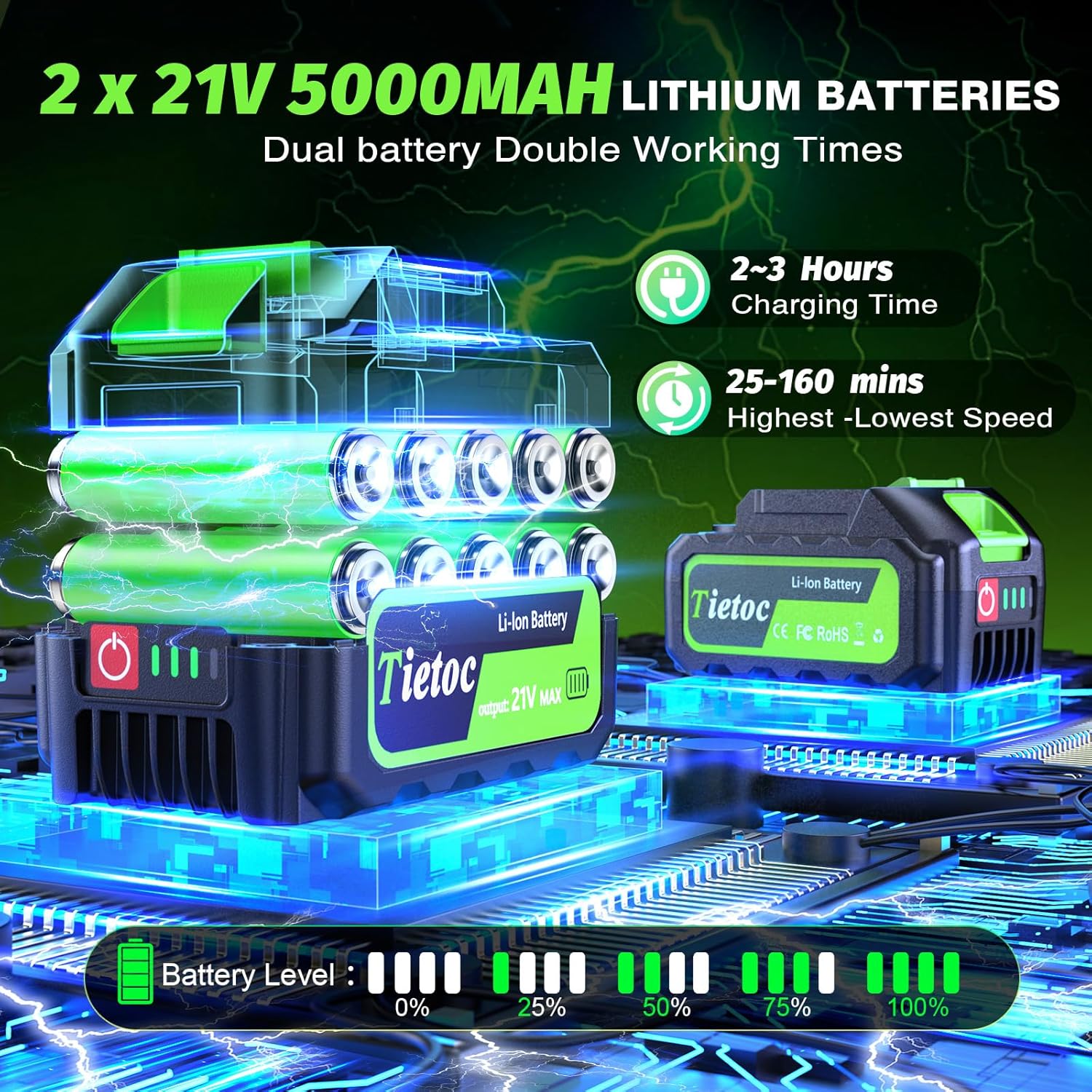 - ๐๐๐๐๐๐๐ฆ๐๐ก ๐๐๐ญ๐ญ๐๐ซ๐ฒ ๐๐จ๐ง๐ -๐ฅ๐๐ฌ๐ญ๐ข๐ง๐ ๐๐ง๐๐ฎ๐ซ๐๐ง๐๐: Battery powered leaf blower with two 21V 5.0Ah high-capacity lithium batteries and a safety charger. Users can charge one while using the other, enabling theoretical "infinite runtime"โideal for continuous tasks like yard cleaning and lawn maintenance. 2 batteries can last at most 25 minutes at highest speed and 160 minutes at lowest speed. The batteries are equipped with overheat protection, which is safe and reliable