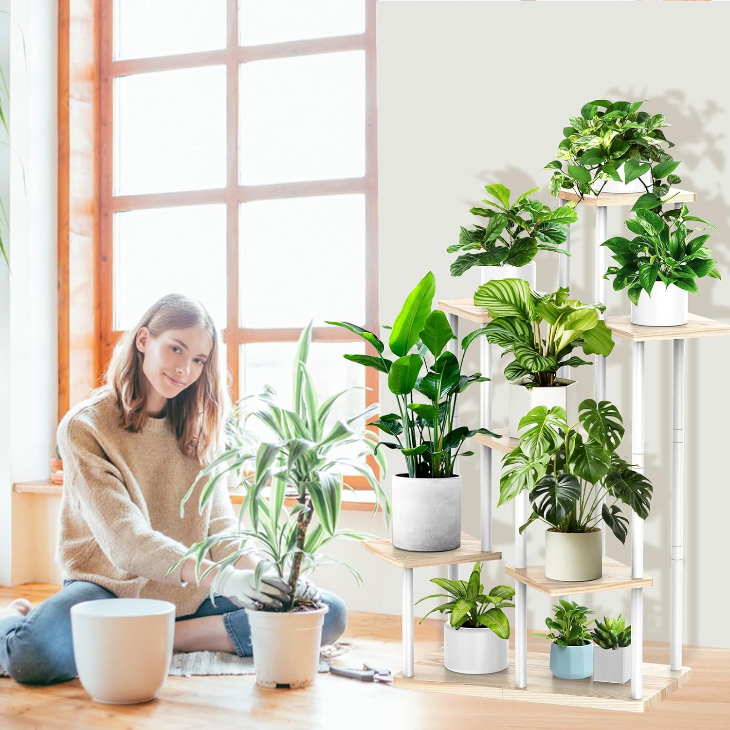 7 Tier Wood Tall Plant Stand Metal Rack Indoor, Multiple Flower Pot Holder Shelves Corner Rack, Planter Shelf Display Rack Storage Organizer for Patio Living Room Balcony Garden(White Oak)