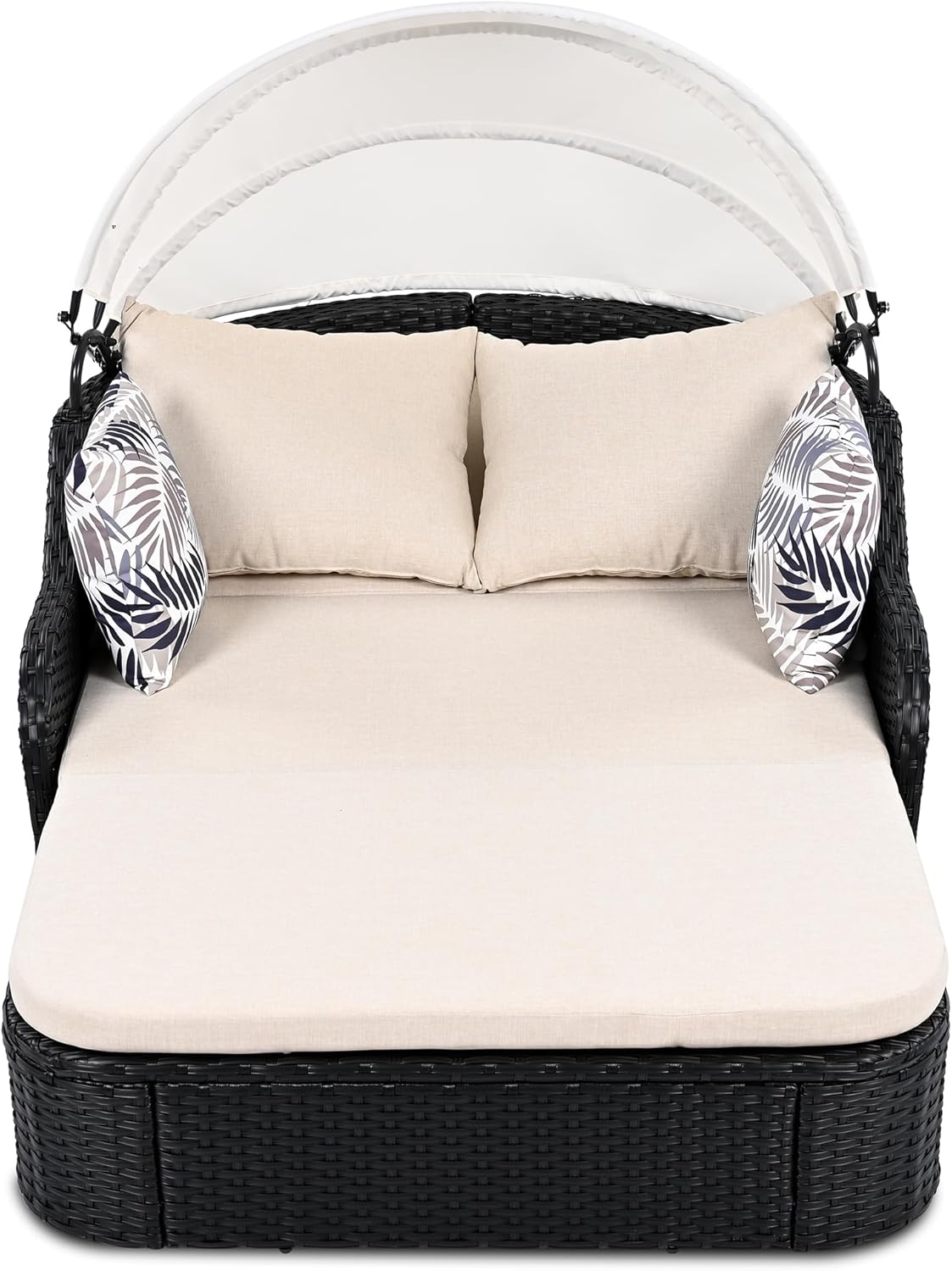 kevinplus Outdoor Patio Sunbed Daybed Double Lounge with Adjustable Canopy for Garden Backyard Pool, PE Rattan Wicker Material & Moveable Cushion Cover, Beige