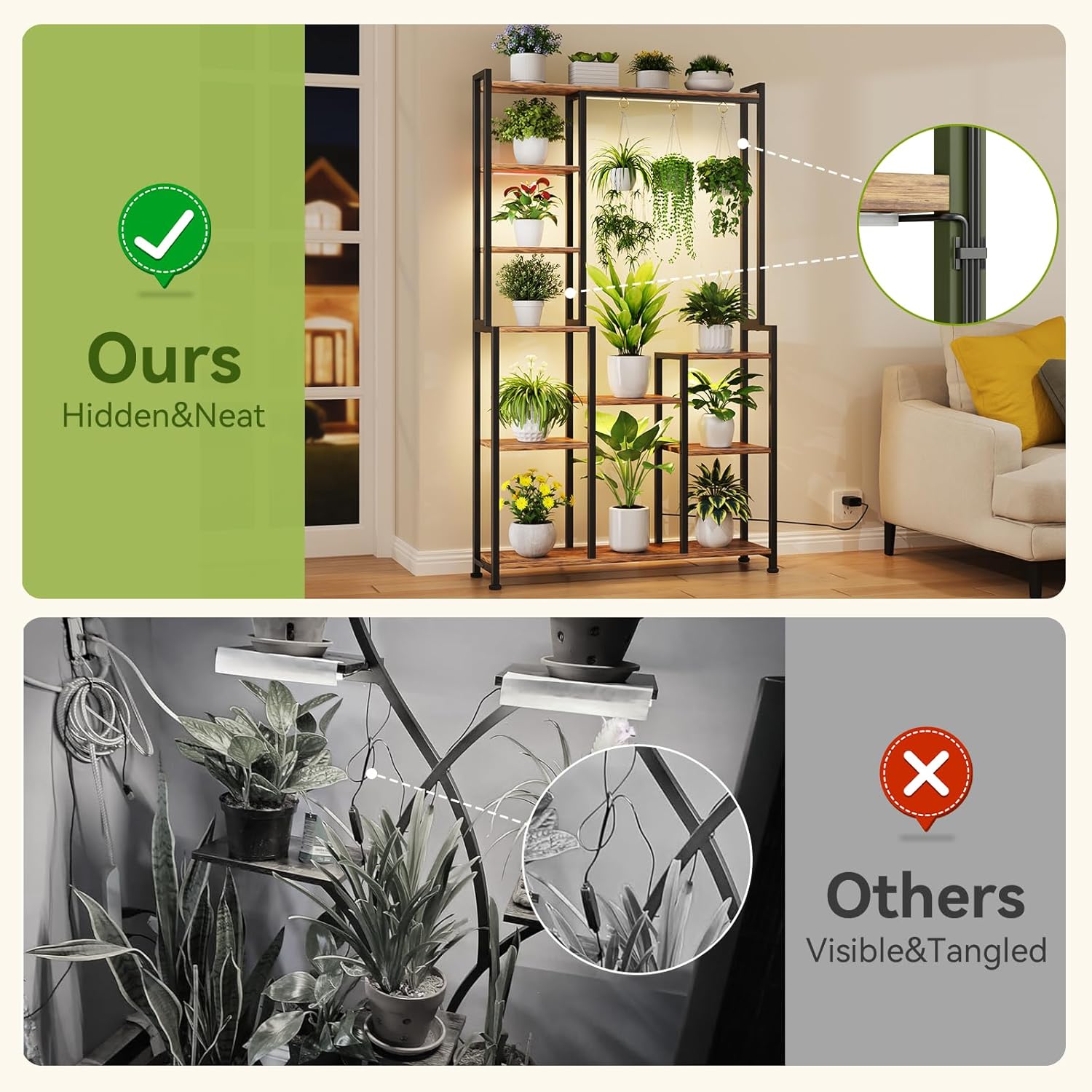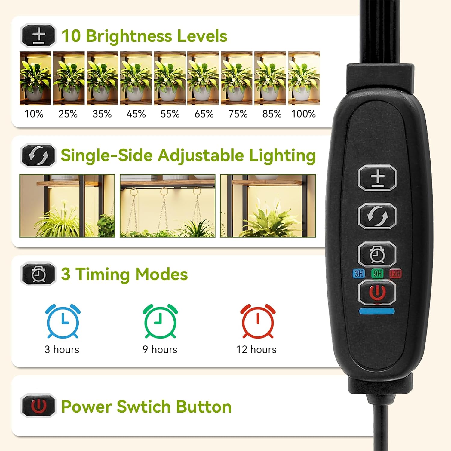 - 🌱【Plant Stand with 5 Grow Lights (Hidden Wire)】 Comes with 1x 23-inch and 4x 9-inch adjustable light strips, allow plants to photosynthesize indoors, with 3h/9h/12h automatic loop timer and 10 dimmable settings, bright enough light for them to thrive, without the need to frequently move plants outdoors for sunlight.