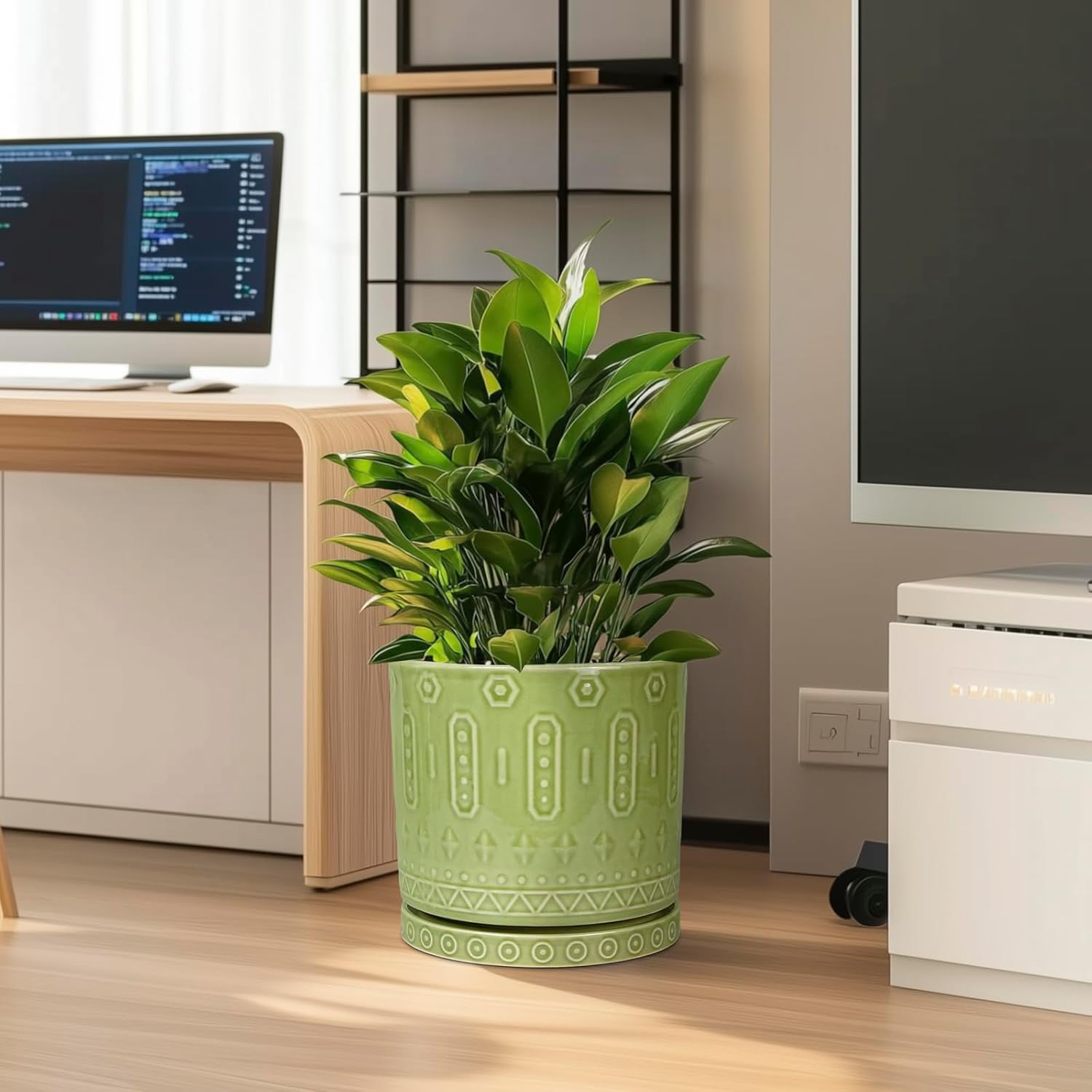 Ceramic Planter - 12 Inch Pots for Plants Indoor Outdoor, Round Large Flower Pots with Drainage Hole and Saucer, Decorative Boho Planter, Home Office Decor, Plant Lover Gifts, Green