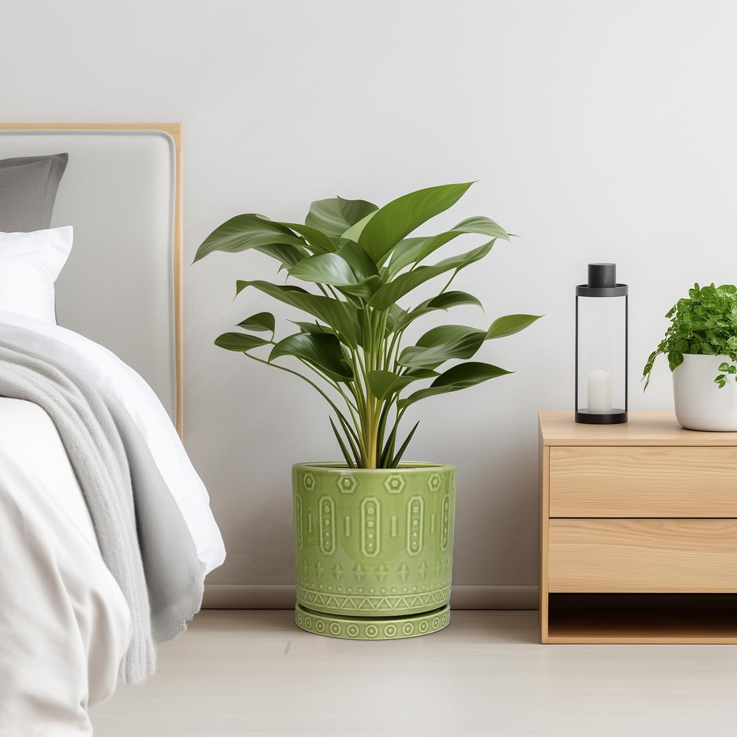 Ceramic Pot for Plants - 10 Inch Indoor Plant Pots with Drainage Holes and Saucer, Boho Round Planter Outdoor, Decorative Large Planter for Flower, Living Room Decor, Garden Gifts, Green