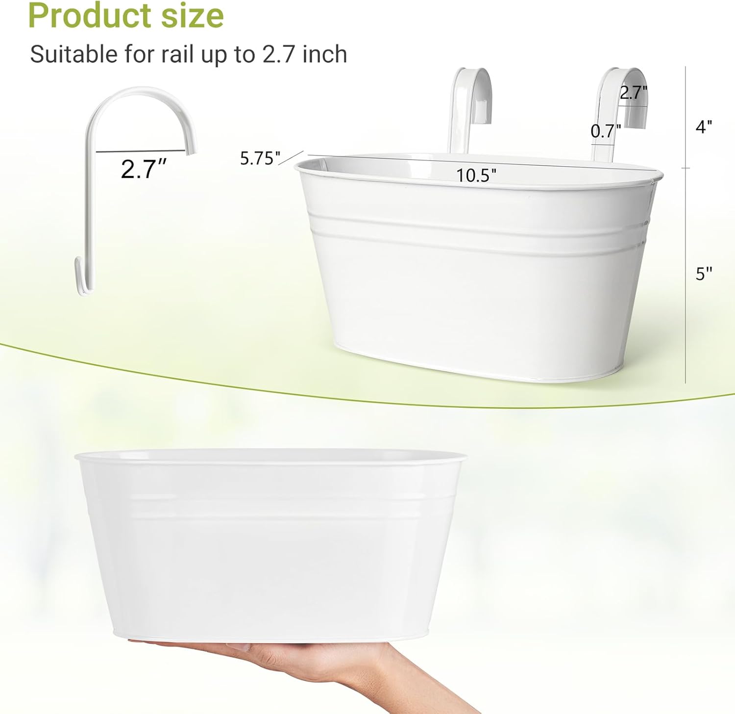 - Size:Planter:10.5" x 5.75" x 5". Hook is 4" x 2.7β x 0.7"(Suitable for rail up to 2.7 inch). Please check the size carefully before purchasing. Pay attention to:The hook is disassembled for transportation,you need to install the iron bucket yourself when it arrive