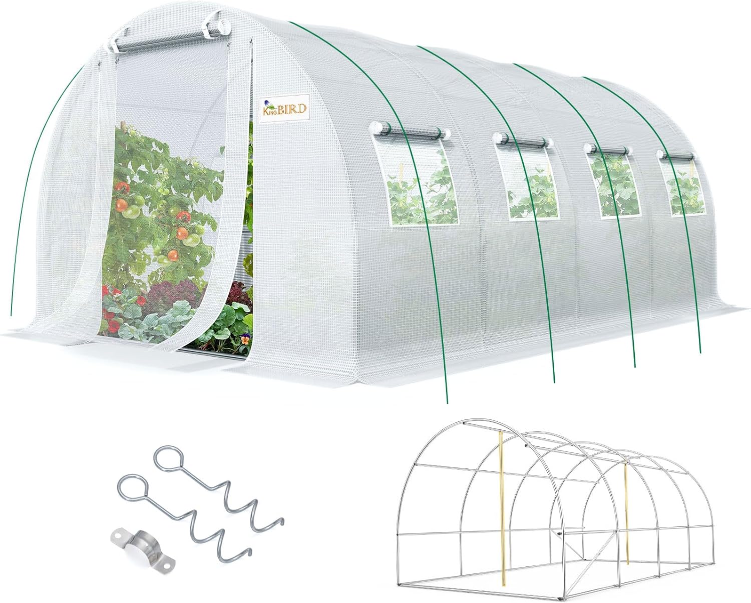 - [Reinforced Frame Structure]--KING BIRD portable plant tent is pro-designed and made of selected galvanized steel, with 3 top crossbars, 2 diagonal & 10 vertical poles at the bottom enhancing the entire structure. 24 stakes and 4 ropes are extra given to fix it on the ground firmly. The 20-foot large space is perfect for you to place abundant home vegetables, flowers plants, etc. [NEW!] 2 supporting poles are added to the top.
