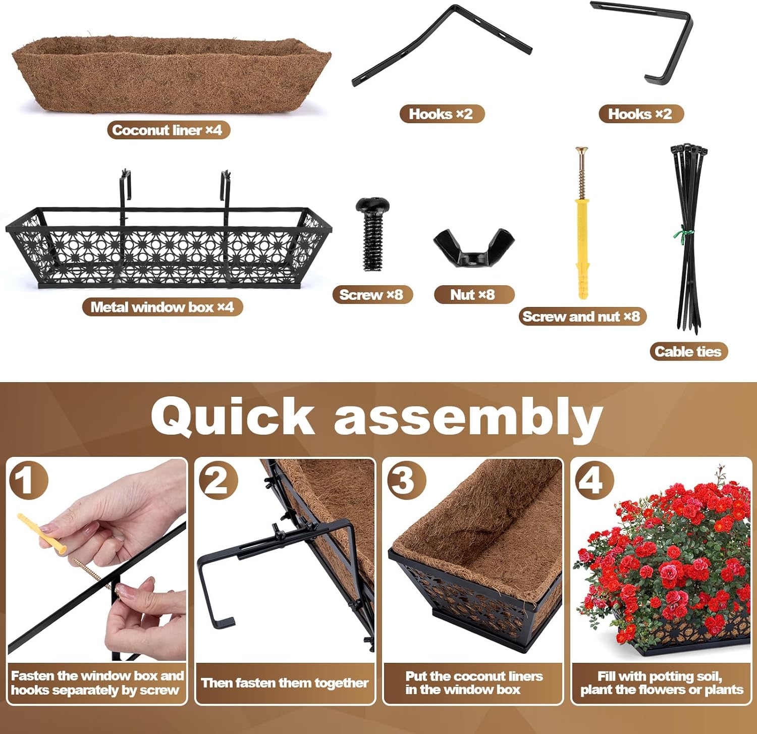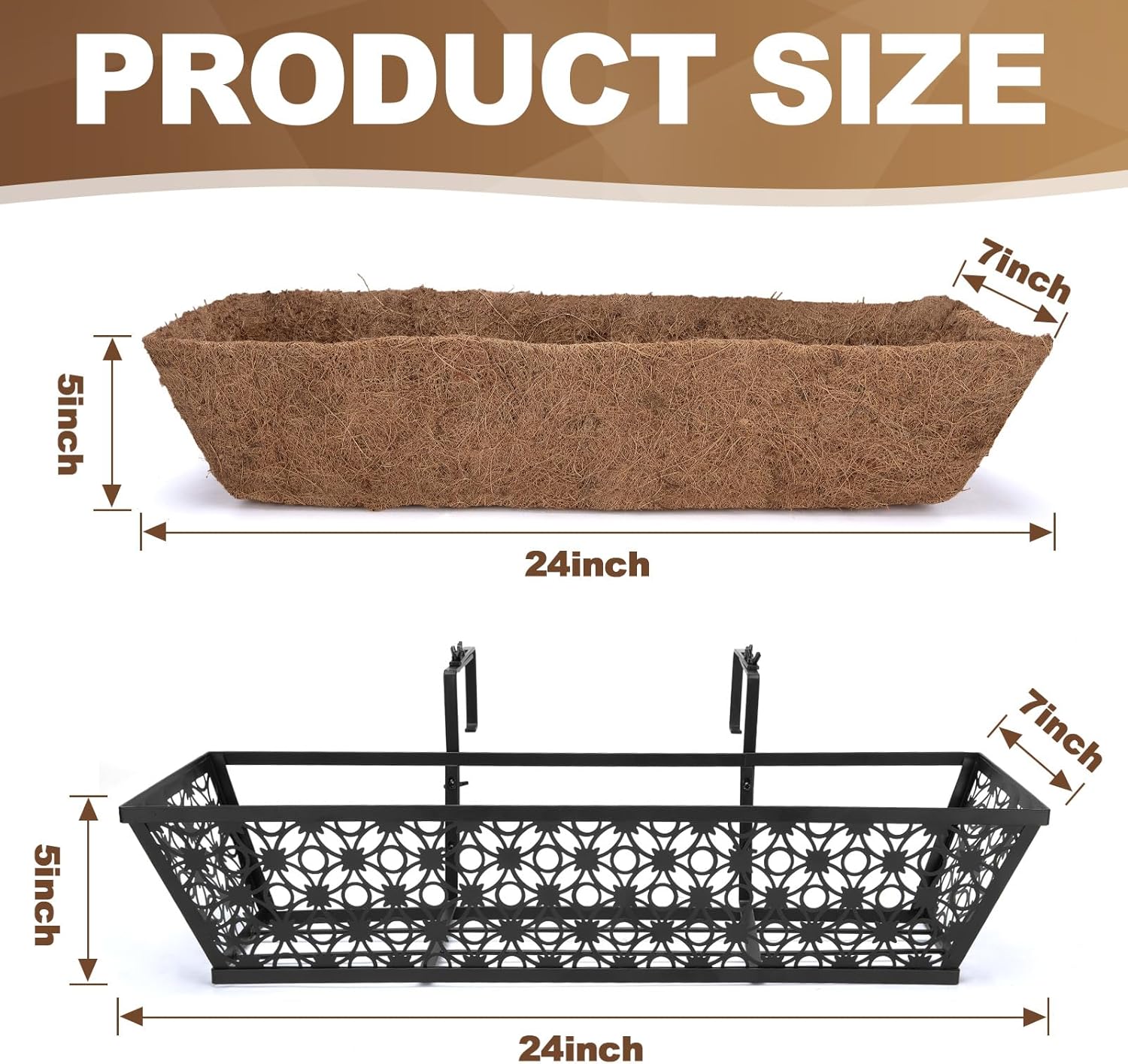 - Perfect Size with Bonus Tool Kit:The metal railing planter measures 24 inches (L×7W×5H). Each set includes four flower boxes with natural coconut liners, and a bonus gardening tool kit to help you create your own mini garden. window boxes planters’s the perfect choice for gardening enthusiasts and makes an ideal gift for gardening lovers
