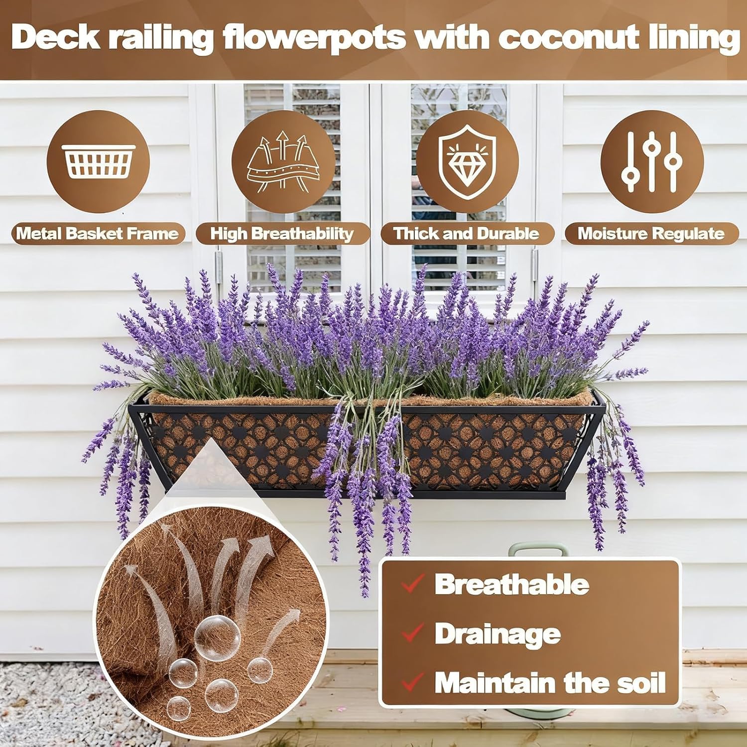 - 【Natural Coconut Shell Liner Hanging Flower Box】 The deck railing planter boxes provides 24 inches of planting space and can accommodate a variety of plants, such as flowers, herbs, vegetables, and more. The natural coconut shell liner offers good breathability and drainage, preventing water buildup and rot, ensuring healthy plant growth