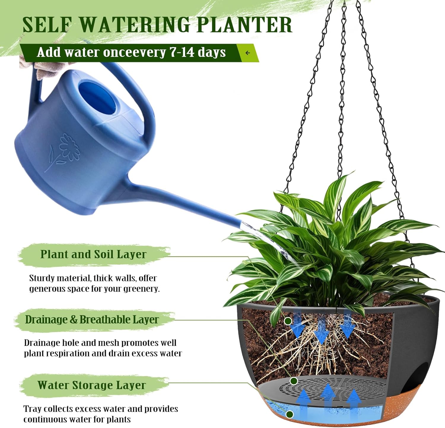 Hanging Planters for Outdoor Indoor Plants, 2 Pack 12 Inch Hanging Basket Plants Outdoor, Self Watering Hanging Planter with Plant Hanger for Garden Home Decoration (Black)