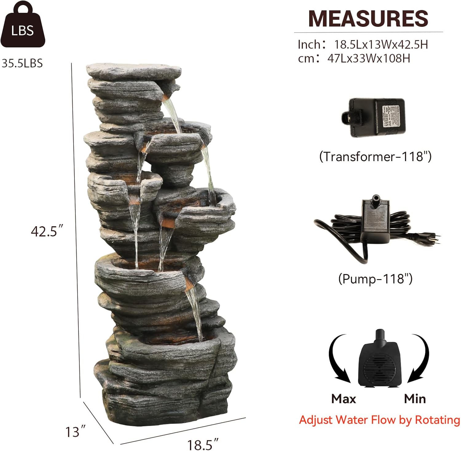 - 【Garden Fountain Information & Care】18.5"L x 13"D x 42.5"H Material: UV-stable resin Includes: Pump, LED lights.Pro Tip: Place on a level surface near a power outlet for optimal performance!