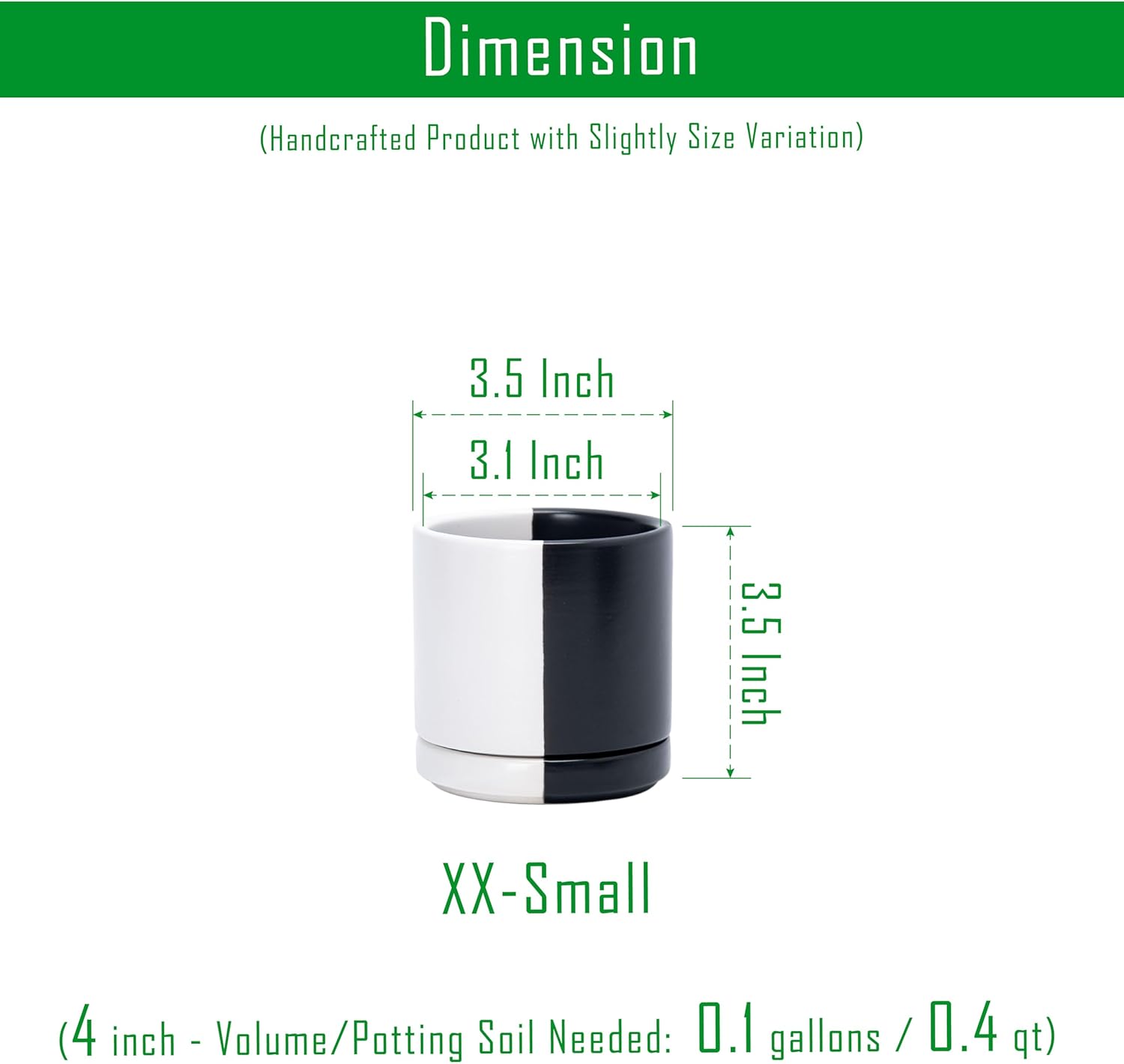 • Multiple Size Options: Available in six sizes (3.5" to 11.8") to fit plants of all types, from small succulents to larger houseplants. XX-Small 3.5 Inch Planter Pot: 3.5" Diameter x 3.5" H, Potting Soil Needed: 0.11 gallons / 0.45 qt.