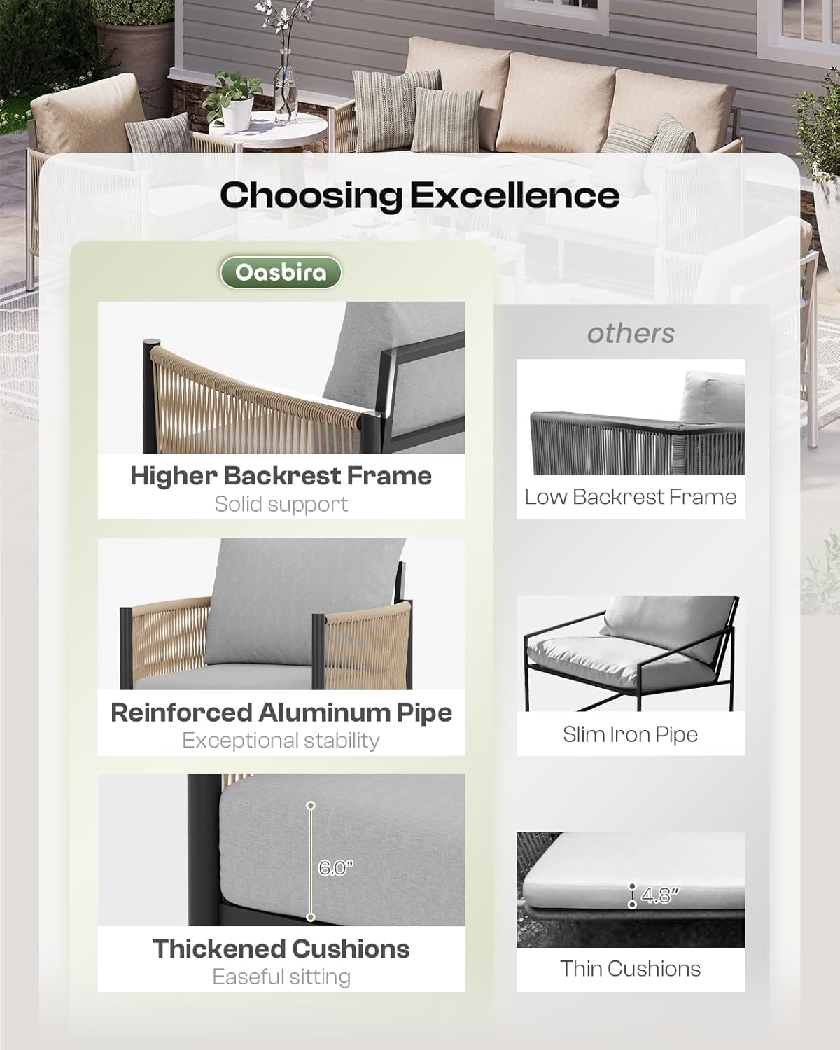 - Ultimate Comfort:The cushions of the Oasbira patio furniture set are filled with honeycomb structure foam, offering exceptional comfort. This outdoor seating furniture features an elevated backrest frame reaching 29.4 inches, providing support that far beyond average patio sets. Each seat is 23.6 inches wide, offering ample space and ensuring ergonomic relaxation