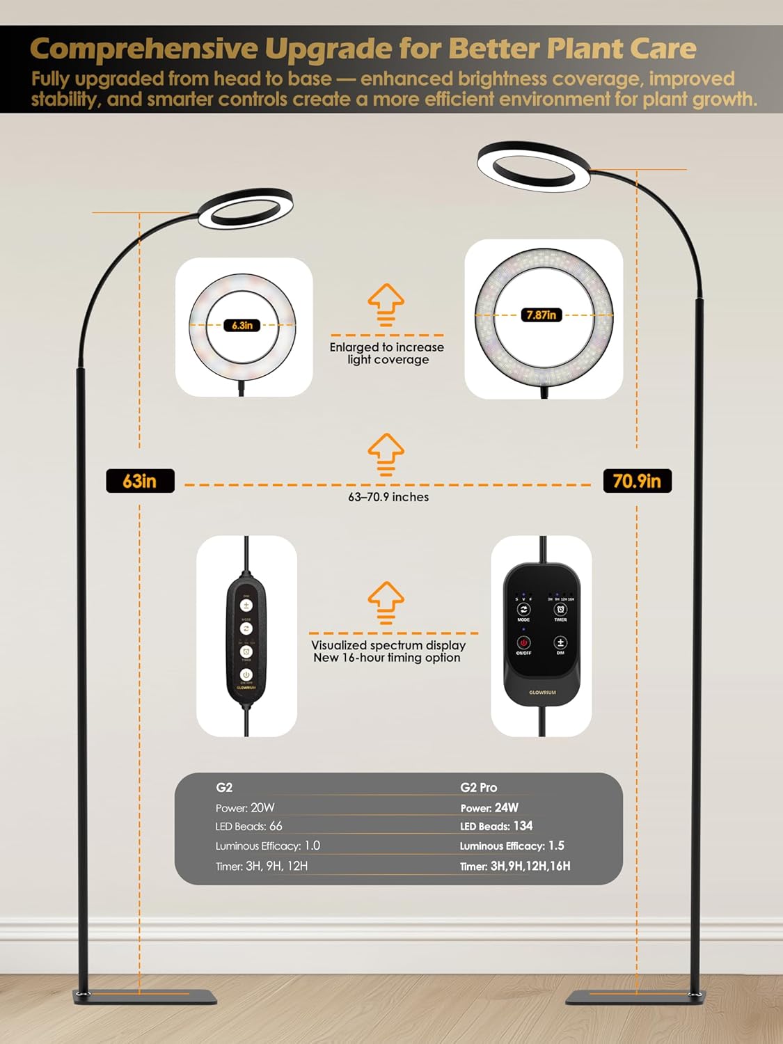 GLOWRIUM Grow Lights for Indoor Plants, 24W Full Spectrum LED Grow Light, Stepless Dimming,3 Lighting Mode and Adjustable Height, Plant Light with 3/9/12/16H Timer (Black, 24W)