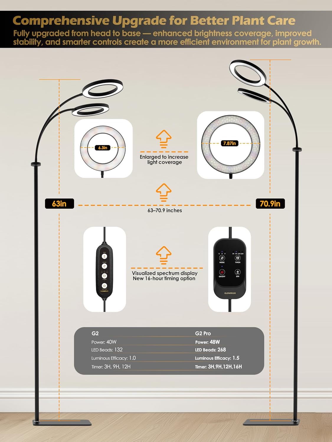 GLOWRIUM Grow Lights for Indoor Plants,Plant Light with 3/9/12/16H Grow Light Timer,2-Head 48W Full Spectrum LED Grow Light, 3 Lighting Mode and Stepless Dimming (Black, 48W)