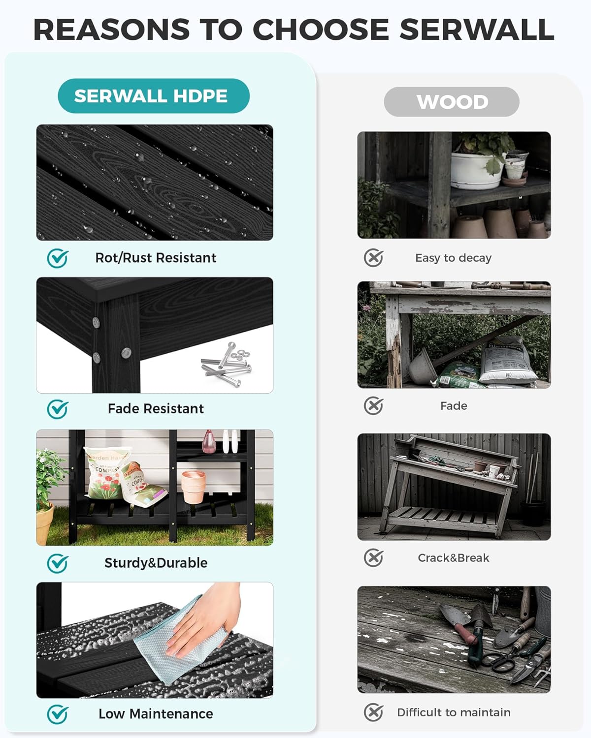 - HDPE Material: Constructed from 100% HDPE material, the SERWALL outdoor potting bench offers high strength and stability, ensuring a long service life. Potting bench table is durable for outdoor use in any weather condition.