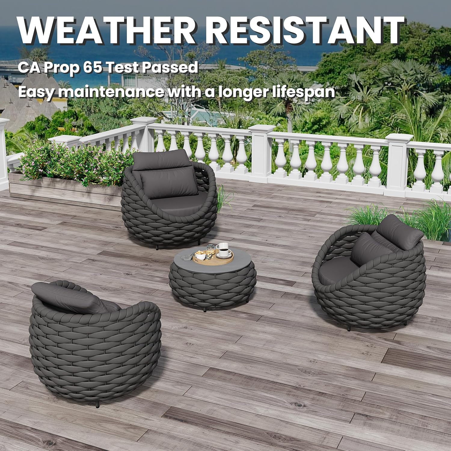 - Furniture set is crafted from reinforced rust-free aluminum alloy frame, wrapped in hand woven polyester rope. The 4 pieces all weather patio upholstered conversation set resists to UV, rain, wind, salt water. Perfect for indoor outdoor even arid or coastal areas