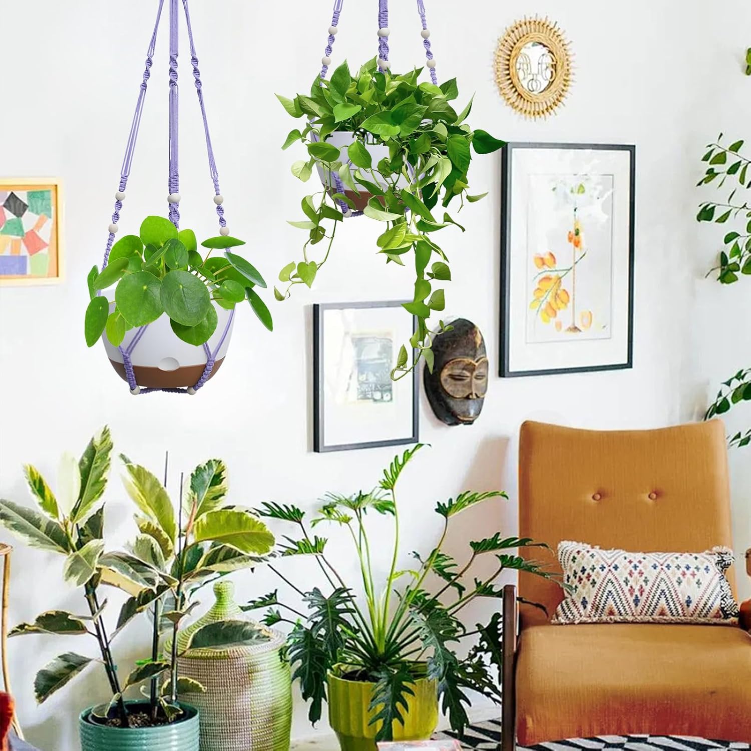 2 Pack Hanging Planters Set,10 Inch Indoor Outdoor Hanging Plant Pot Basket,Hanging Flower Pot with Drainage Hole with 3 Hooks for Garden Home(Purple Hanger White Planters)