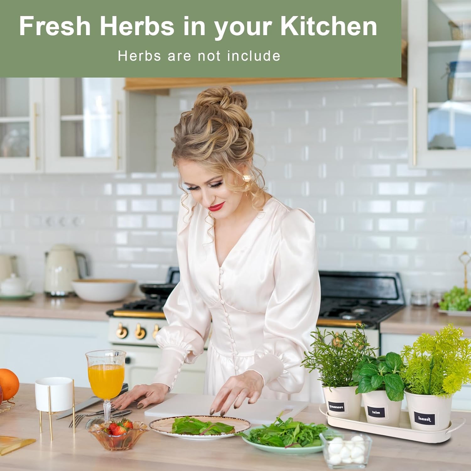 4" Herb Garden Planter Kit, Indoor Herb Planters with Tray, Set of 3 Metal Windowsill Pots for Flower Plants with Drainage Hole, Customizable Labels & Marker Pen, Beige