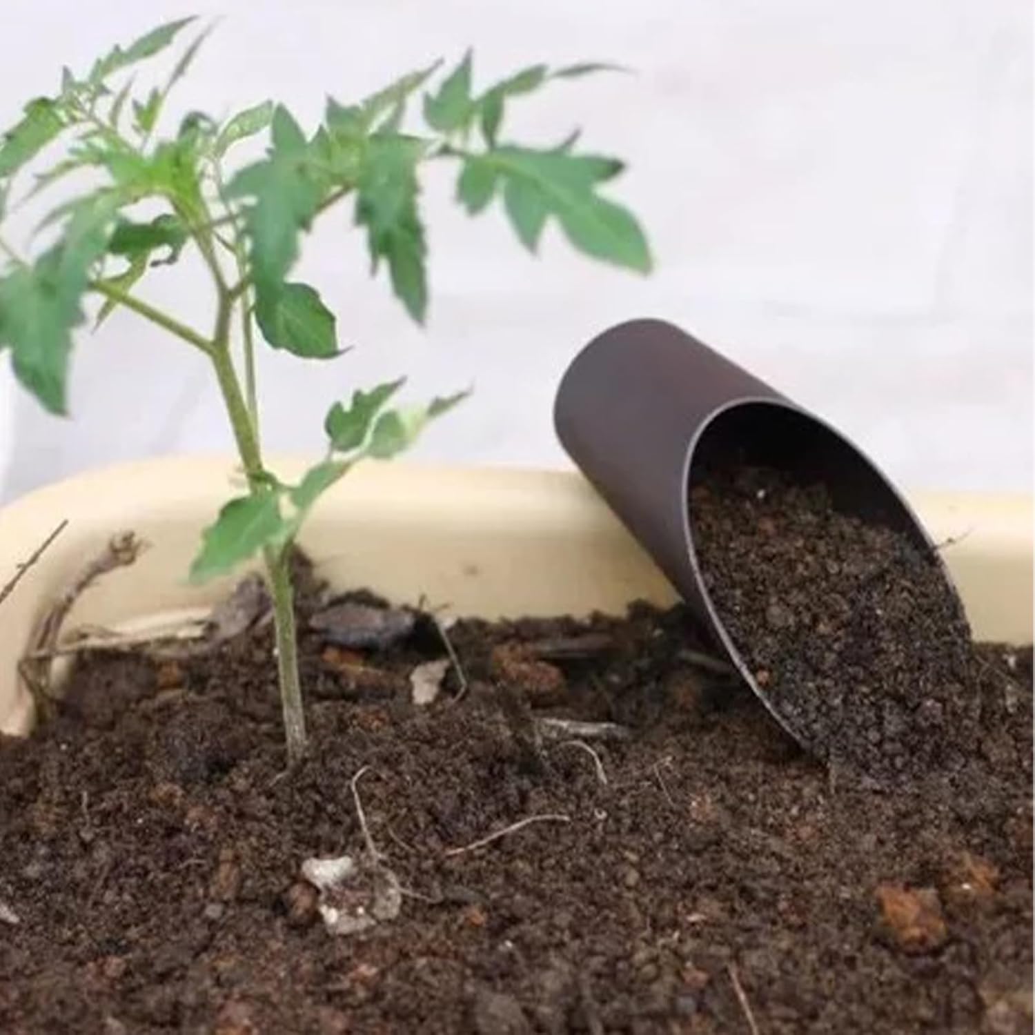 - This potting soil scoop is made of durable, easy-to-clean plastic—simply rinse off after use. Its ergonomic design ensures mess-free potting and effortless handling