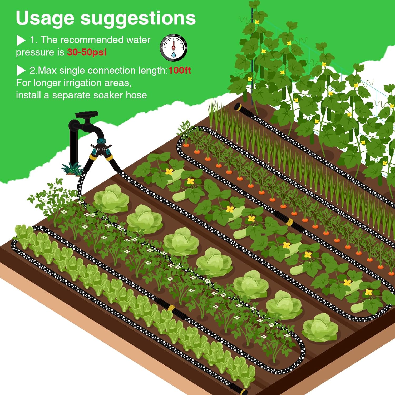 - 【Usage suggestions】 - Gardening experts with 10+ years of experience say: Because of the pipe’s built-in holes, water flows slower at the end – that’s why we suggest connecting no more than 50ft at once. Keep water pressure between 40-60psi and always add the included washers before use. These simple steps protect your pipes and keep them working great, even after years of heavy use.