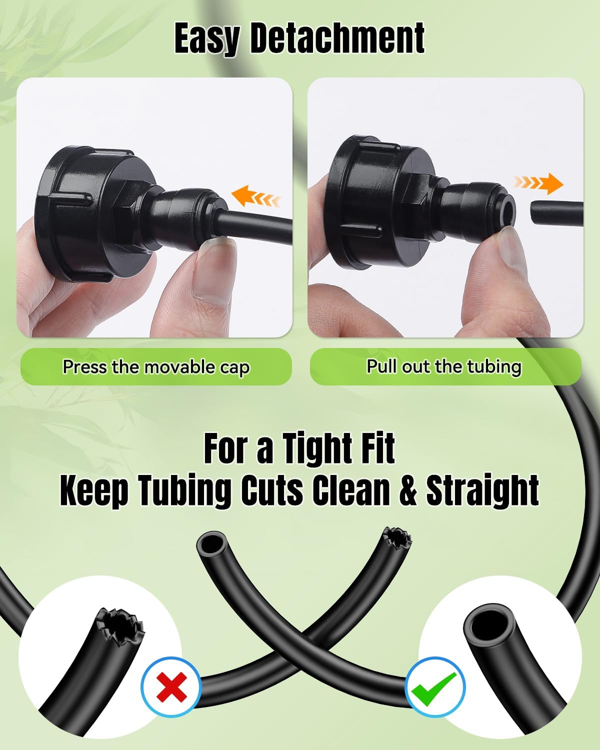 - Push-to-Fit Design: No tubing softening or special tools required! Simply screw the garden hose adapter onto your faucet, then push your tubing into the quick-connect outlet. To detach the tubing, press the movable cap on the outlet and pull it out