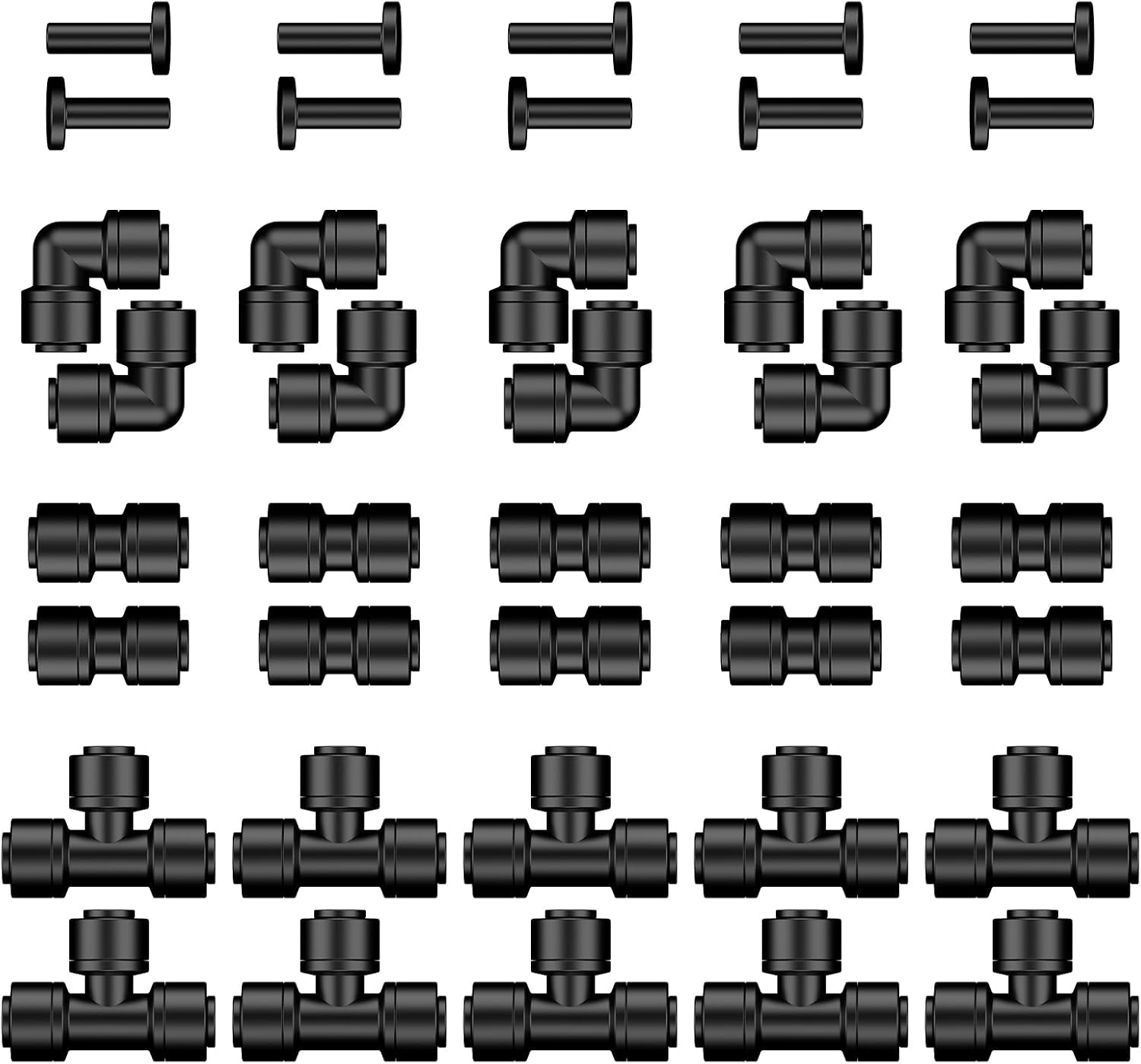 - Drip Irrigation Fittings Kit: Include forty 1/4-inch drip irrigation tubing fittings β 10 tee connectors, 10 straight couplings, 10 elbow connectors, and 10 end plugs. Made of weather-resistant plastic, they withstand years of indoor or outdoor service