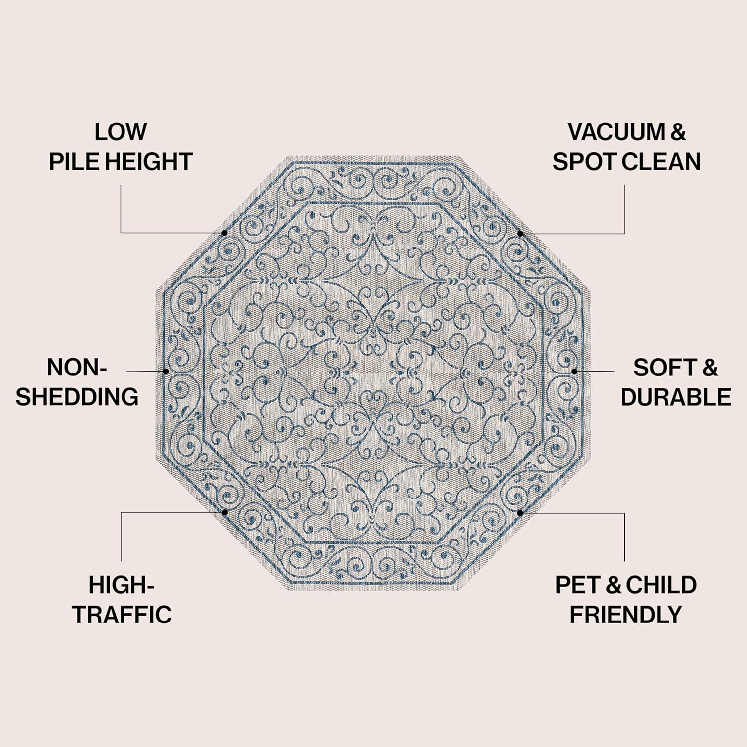 JONATHAN Y SMB106C-8TGN Charleston Vintage Filigree Textured Weave Gray/Navy 8' Octagon Indoor/Outdoor Area Rug, Non-Shedding, Stain Resistant,Fade Resistant, Easy-Cleaning for Backyard Patio, Porch