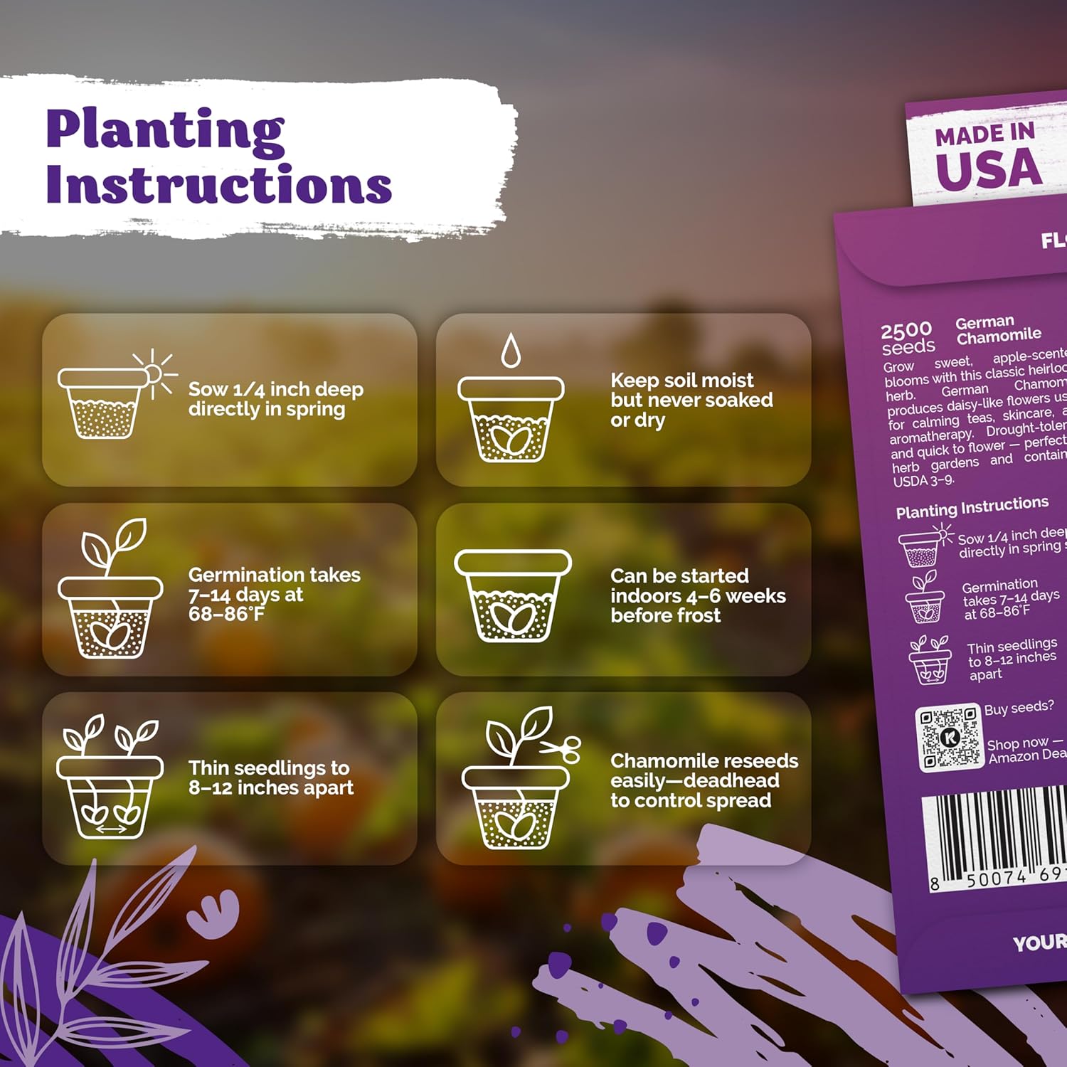 KVITER 2,500 German Chamomile Seeds for Planting (Matricaria Chamomilla/Recutita) – Heirloom & Non-Gmo Medicinal Herb Seeds, Flowers for Remedies & Chamomile Tea Organic – Indoors/Outdoors Herb Garden