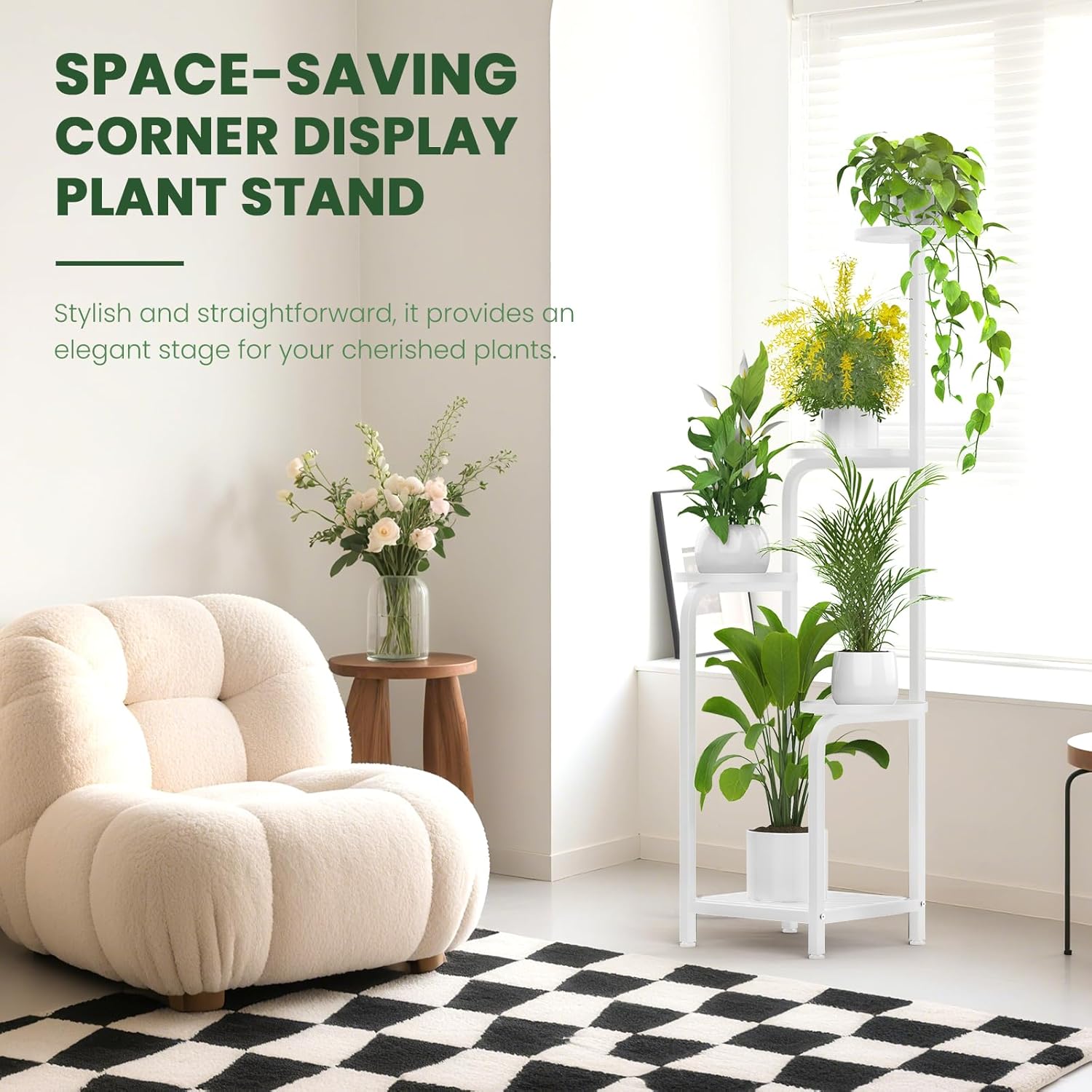 - 【Corner plant stand】 Space-saving square design fits snugly into cramped corners, making it an ideal small stand for apartments or dorms. Standing 46.8" tall, this corner plant stand features cascading tiers that serve as plant holders, creating stunning vertical displays for your favorite plants or cherished decor – perfect for transforming any room with minimal footprint