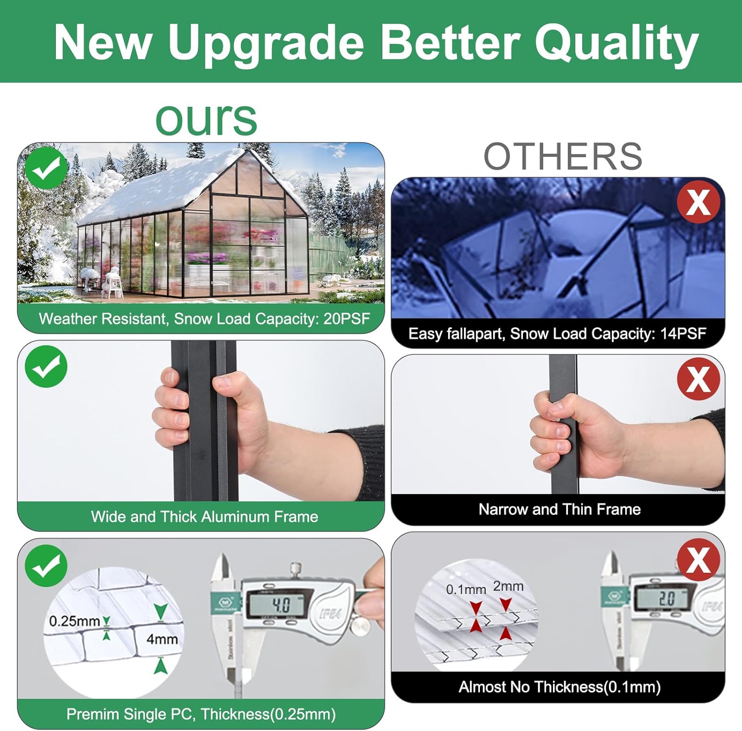 - Sturdy Frame: Our greenhouse kit boasts a robust rust-resistant aluminum frame designed to withstand various weather conditions. 2 skilled enthusiasts can assemble this greenhouse kit within just 4-6 hours. Introducing patented technology, Easy assembly, saving you 50% of your time. Gone are the days of tedious setups. With a simple push and locking screw, our Quick Connect ensures a reliable, secure, and swift link-up. It can also support snow loads of up to 20PSF.