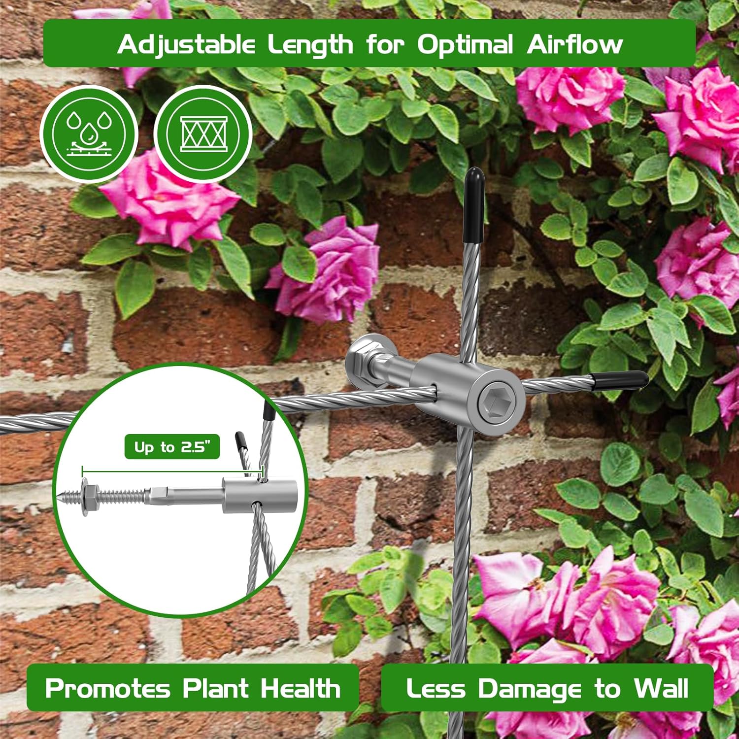 - 🌱「Enhanced Airflow for Plant Health」- The 2.5-inch gap from the wall after installation is designed to prevent moisture buildup, keeping everything fresh yet dry and improving airflow around your plants. This trellis wire kit enhances their health and provides a perfect environment for climbing plants. The 7 x 7 stainless steel cable not only looks great but also provides a reliable surface for plants to grip and climb