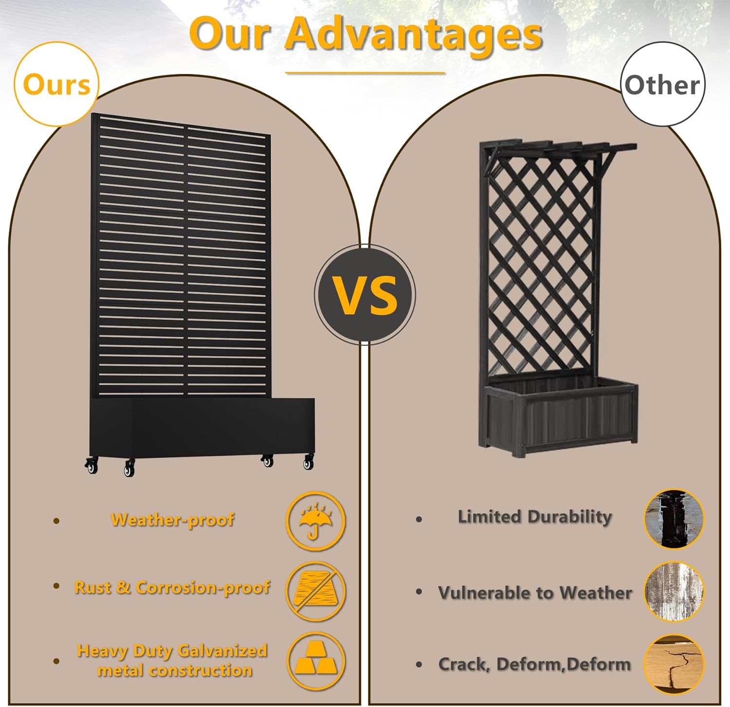 - 【3-in-1 Metal Planter Box with Trellis】This 72.1-inch high Metal Planter Box with Trellis functions as a raised garden bed for flowers, vegetables, or fruits, a strong support for climbing plants, and a stylish privacy screen. Perfect for versatile outdoor planting and decoration.