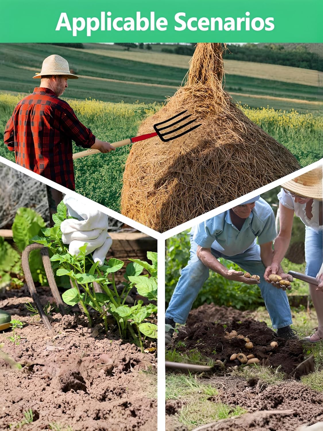 - Scope of Application: The sharp V-shaped tines of the digging fork can quickly penetrate hard soil, which can be used for digging and loosening soil, harvesting root vegetables such as potatoes and sweet potatoes, composting and so on.