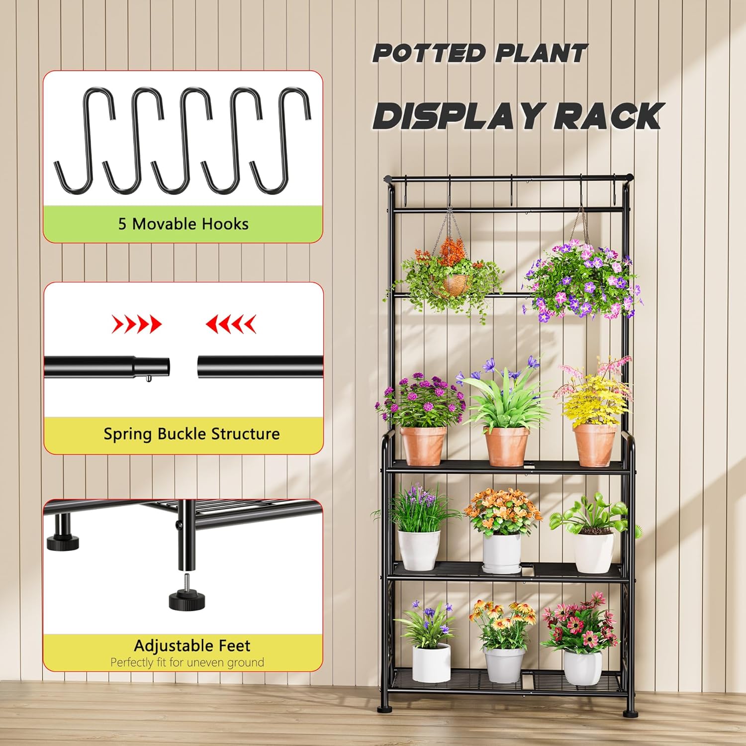 - STABLE & PROTECTIVE FEATURES: Features adjustable non-slip feet to prevent scratches on any floor surface and ensure stability on uneven ground. The top includes 5 sturdy hooks for hanging small potted plants, lanterns, or garden tools.