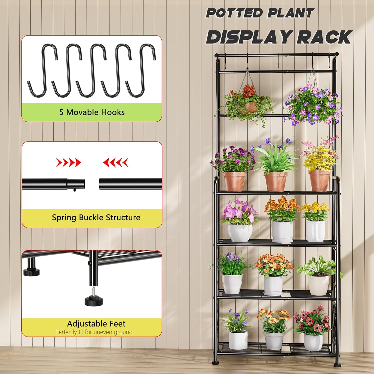 - STABLE & PROTECTIVE FEATURES: Features adjustable non-slip feet to prevent scratches on any floor surface and ensure stability on uneven ground. The top includes 5 sturdy hooks for hanging small potted plants, lanterns, or garden tools.