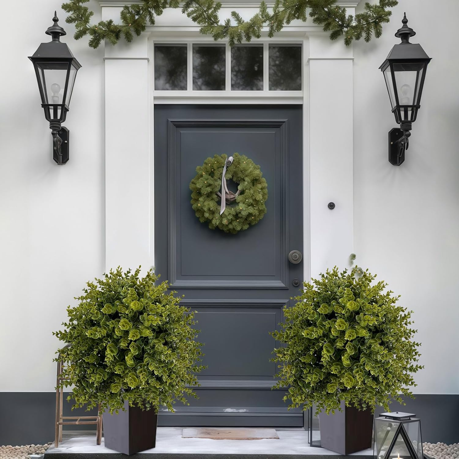 - 【2 Eucalyptus Topiary Balls】 You will receive 2 Eucalyptus Topiary Balls Artificial Outdoor, each standing 24 inches tall. These outdoor faux plants are crafted from high-density PE simulated pine needles and feature natural wood-grain trunks, with lifelike gradient green leaves and intricate detailing. The UV-resistant coating ensures vibrant color retention for 3 to 5 years, making these artificial plants outdoor nearly indistinguishable from real foliage even up close.