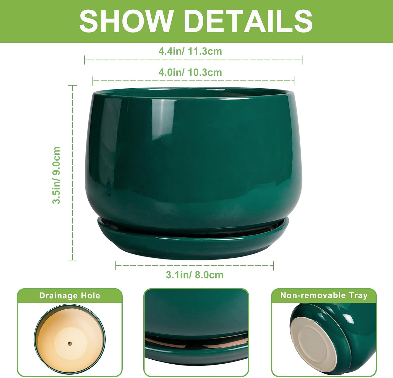 - Dimensions: The waist diameter of these ceramic plant pots is 4.4"/ 11.3cm, the external caliber is 4.0"/ 10.3cm, the height is 3.5"/ 9.0cm. This green plant pot is an ideal choice for growing succulent plants, cacti, aloe vera, orchids, snake plant, african violet, mint, rosemary, herbs, and other indoor & outdoor plants