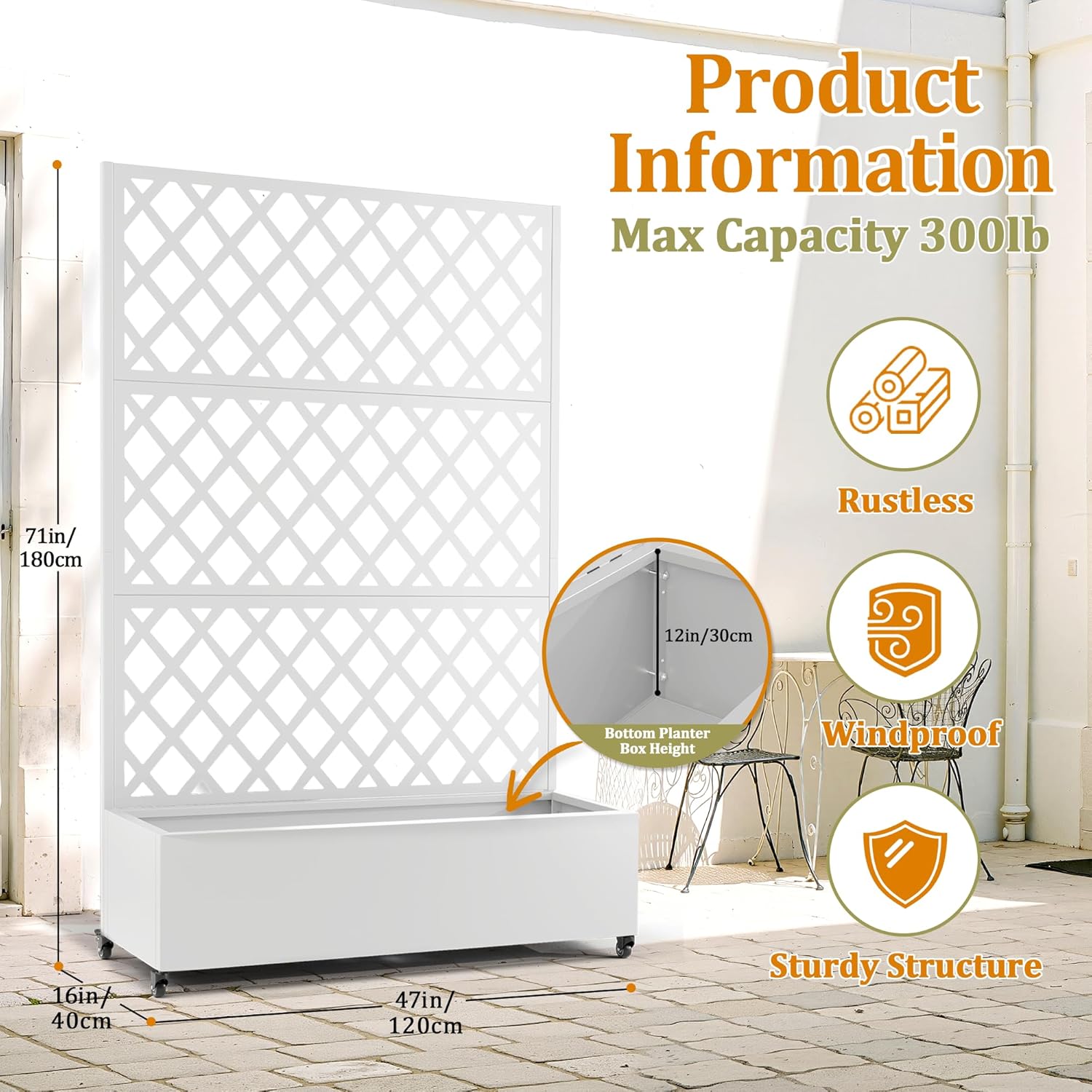 - 💧【Spacious and Efficient Planting Area】Enjoy abundant space in this metal planter box with trellis, ideal for vegetables, herbs, and climbing flowers. Drainage holes prevent waterlogging, making it a perfect garden raised bed for climbing plants. With its vertical structure, this metal planter with privacy screen allows you to grow upward, saving ground space. Plus, this metal planter box with trellis is great for small patios or urban gardens.
