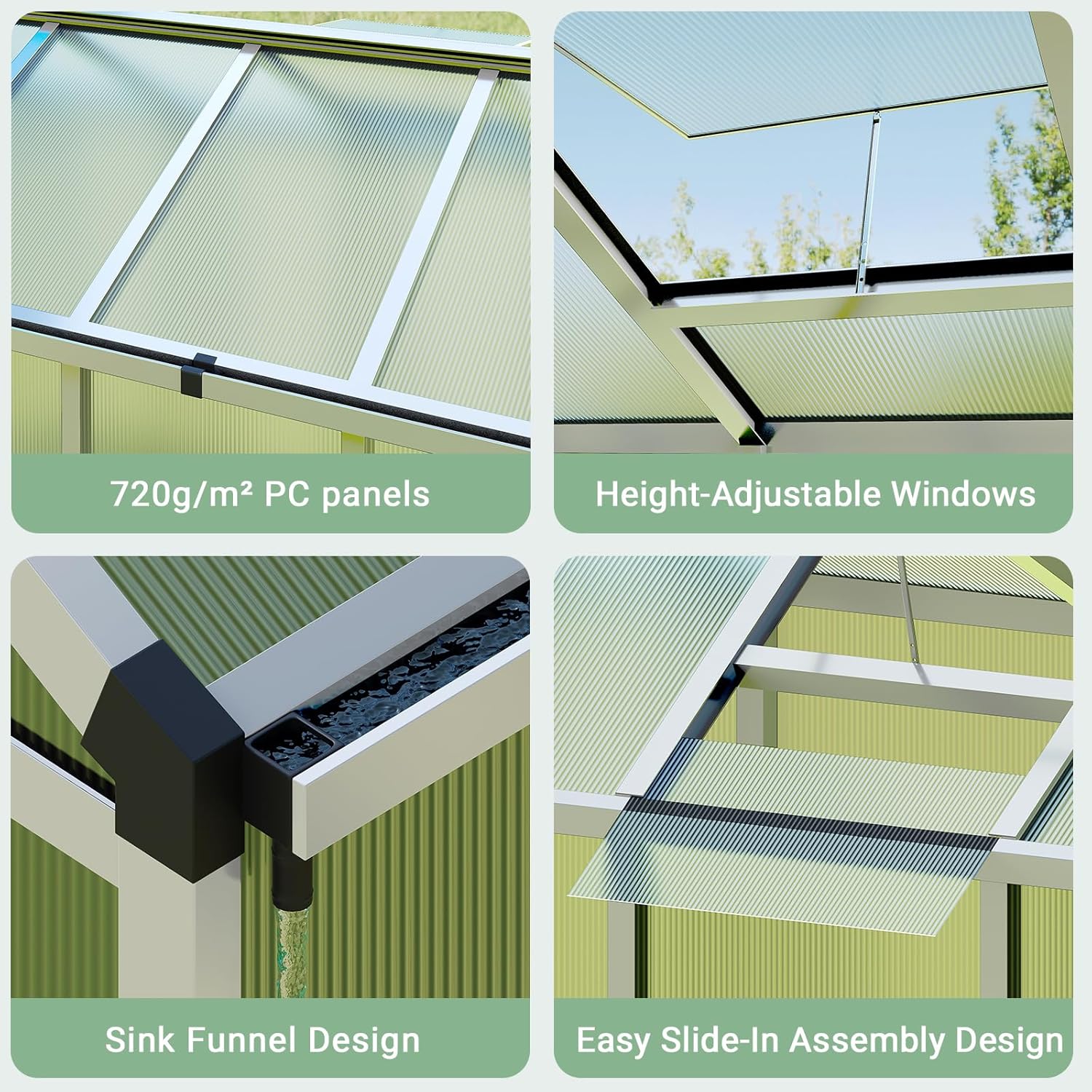 - 【Resilient Construction】Designed to endure challenging weather, our greenhouse features 720g/m² polycarbonate panels and a solid aluminum steel frame. This design ensures stability and protection during heavy rain and gale. Keep your plants safe and thriving in a reliable greenhouse built to last.