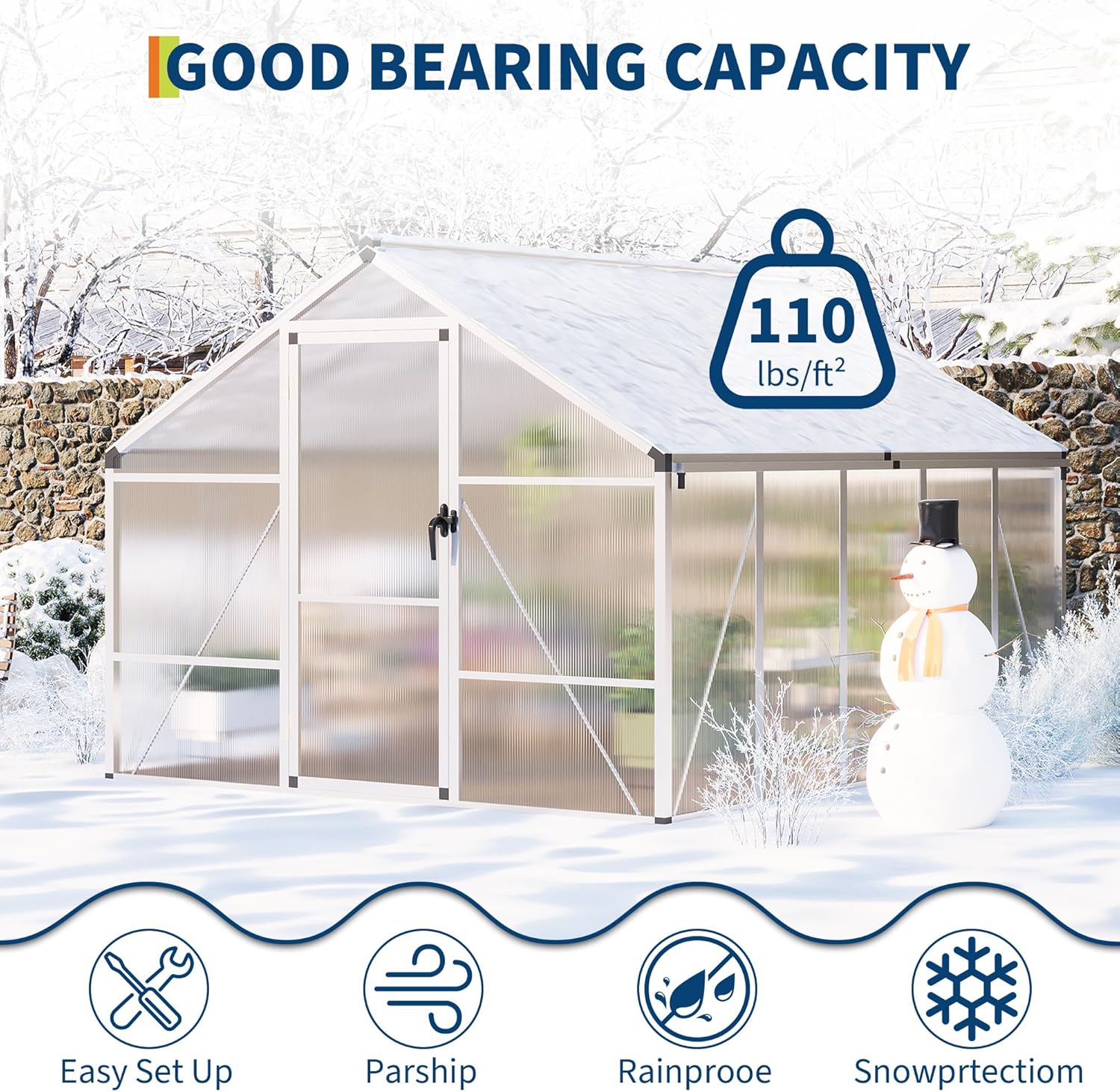 - 【Resilient Construction】Designed to endure challenging weather, our greenhouse features 720g/m² polycarbonate panels and a solid aluminum steel frame. This design ensures stability and protection during heavy rain and gale. Keep your plants safe and thriving in a reliable greenhouse built to last.