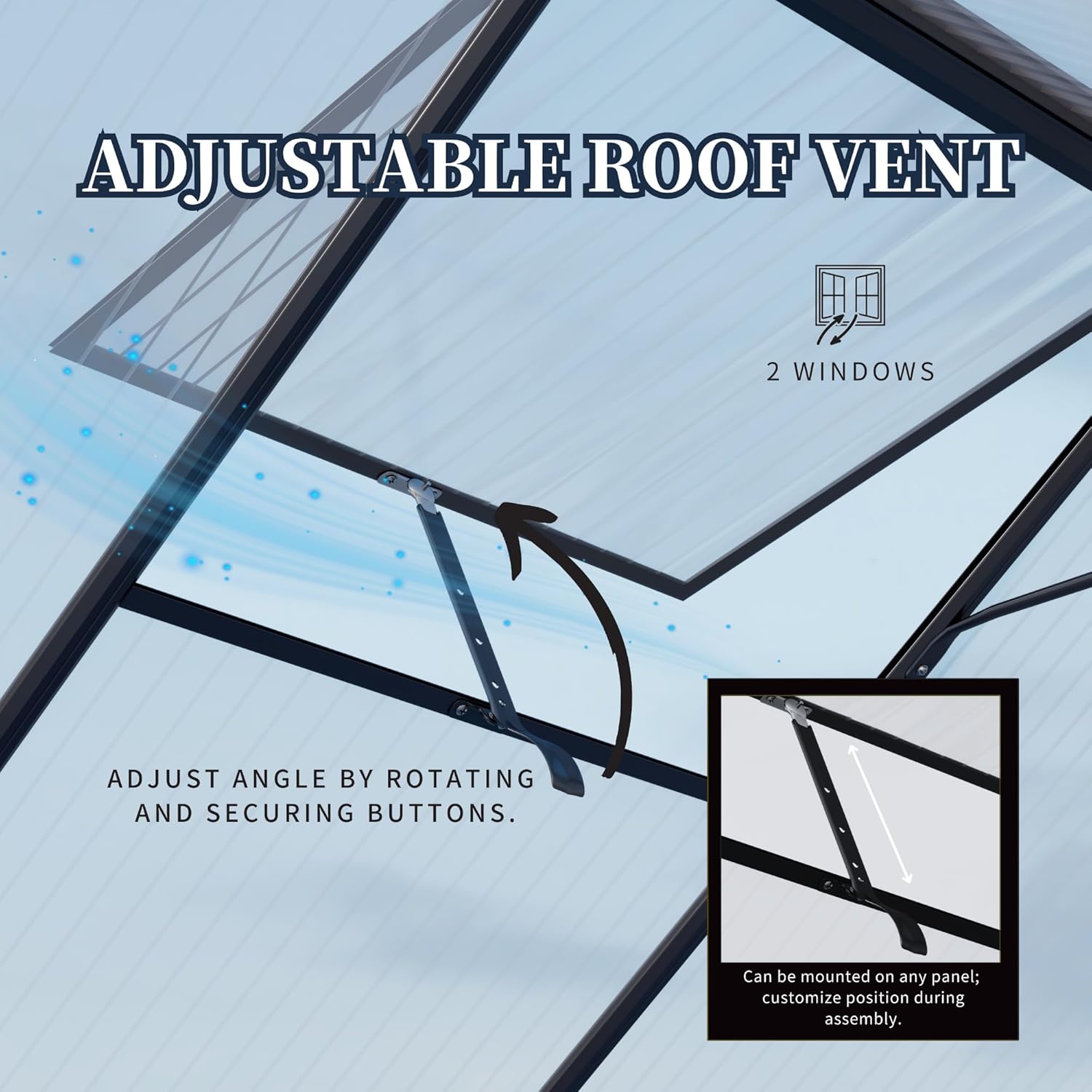 - 【Smart Ventilation System】Our greenhouse is thoughtfully designed with adjustable skylights and sliding doors, providing you with complete control over the temperature and humidity levels during the winter months. This level of flexibility not only allows you to create the perfect microclimate for your plants but also ensures they thrive in an optimal environment, promoting healthy growth and vibrant blooms.