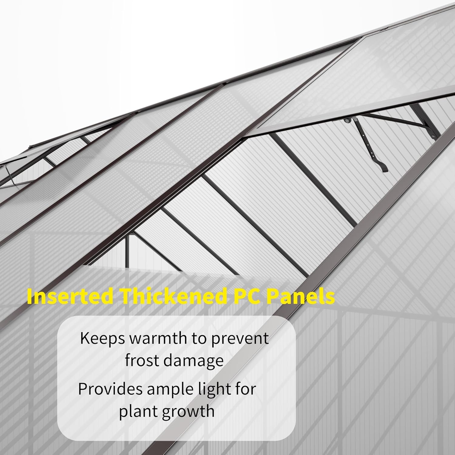 - 【Reinforced Twin-Wall Polycarbonate】 Our outdoor greenhouses feature reinforced 4.6mm polycarbonate panels that offer high light transmission and superior heat retention compared to traditional glass. This creates optimal conditions for plant growth. Furthermore, the panels are temperature adaptable, functioning effectively in both low and high temperatures without significant changes. They are also wear-resistant, lightweight, and easy to transport and disassemble.